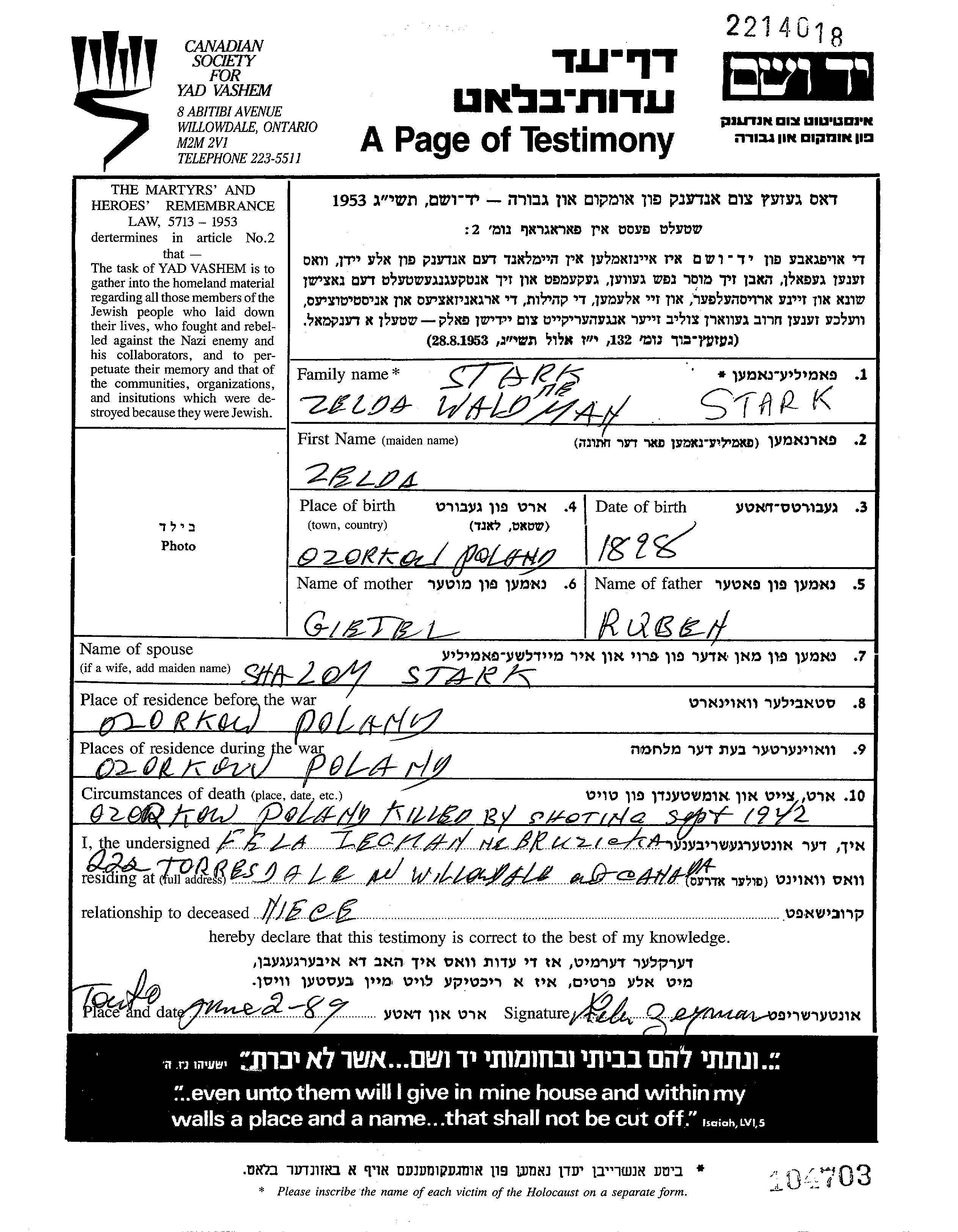 Zelda Stark, geb. Waldman wurde im Jahr 1898 in Ozorkow, Polen geboren. Sie war die Tochter von Reuven und Gietel. Sie war mit Shalom Verheiratet. Vor dem Zweiten Weltkrieg lebte sie in Ozorkow, Polen. Während des Krieges war sie in Ozorkow, Polen.