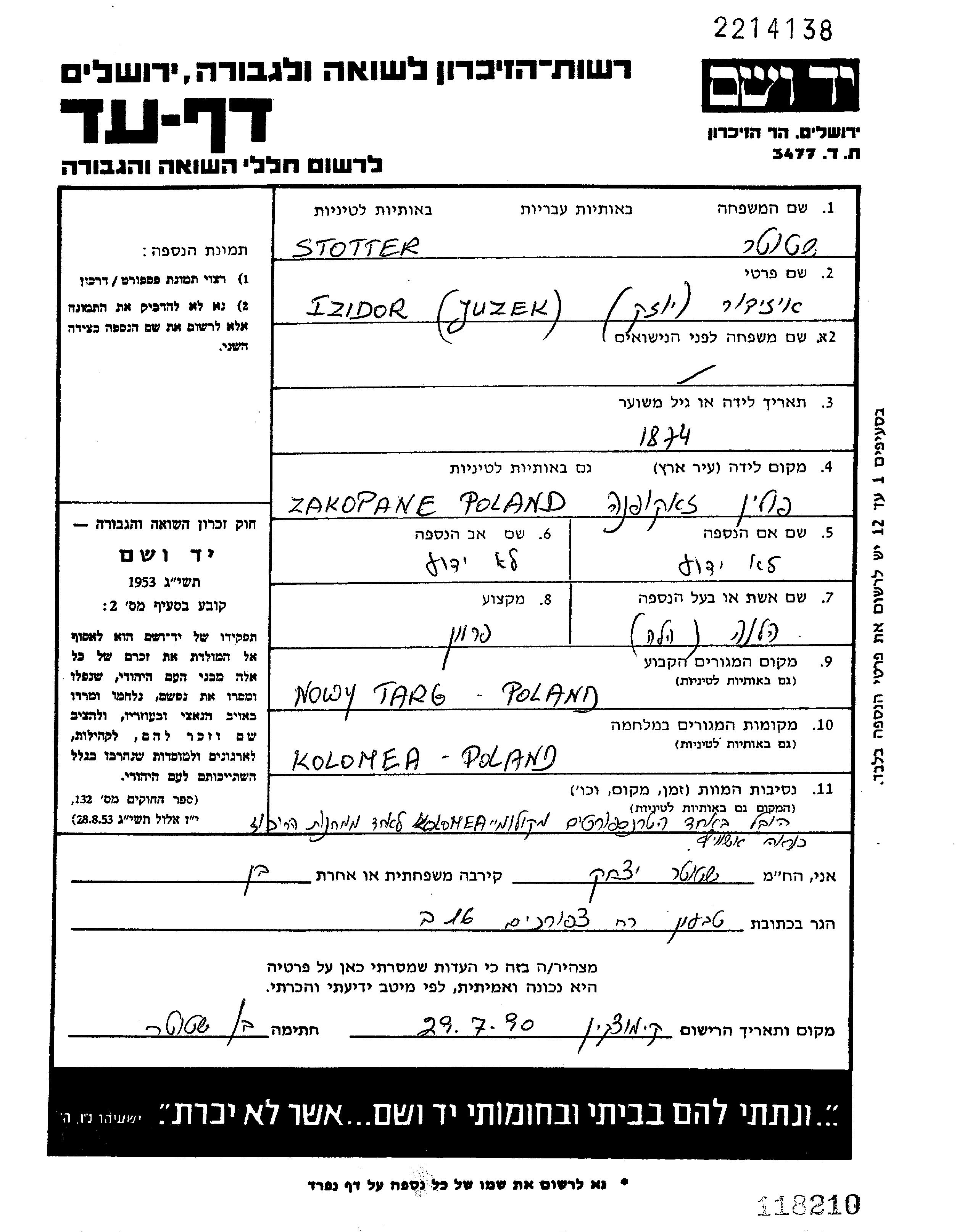 Juzek Izidor Stotter wurde im Jahr 1874 in Zakopane, Polen geboren. Er war Kürschner/-in und mit Helena Hela Verheiratet. Vor dem Zweiten Weltkrieg lebte er in Nowy Targ, Polen. Während des Krieges war er in Kolomyja, Polen.