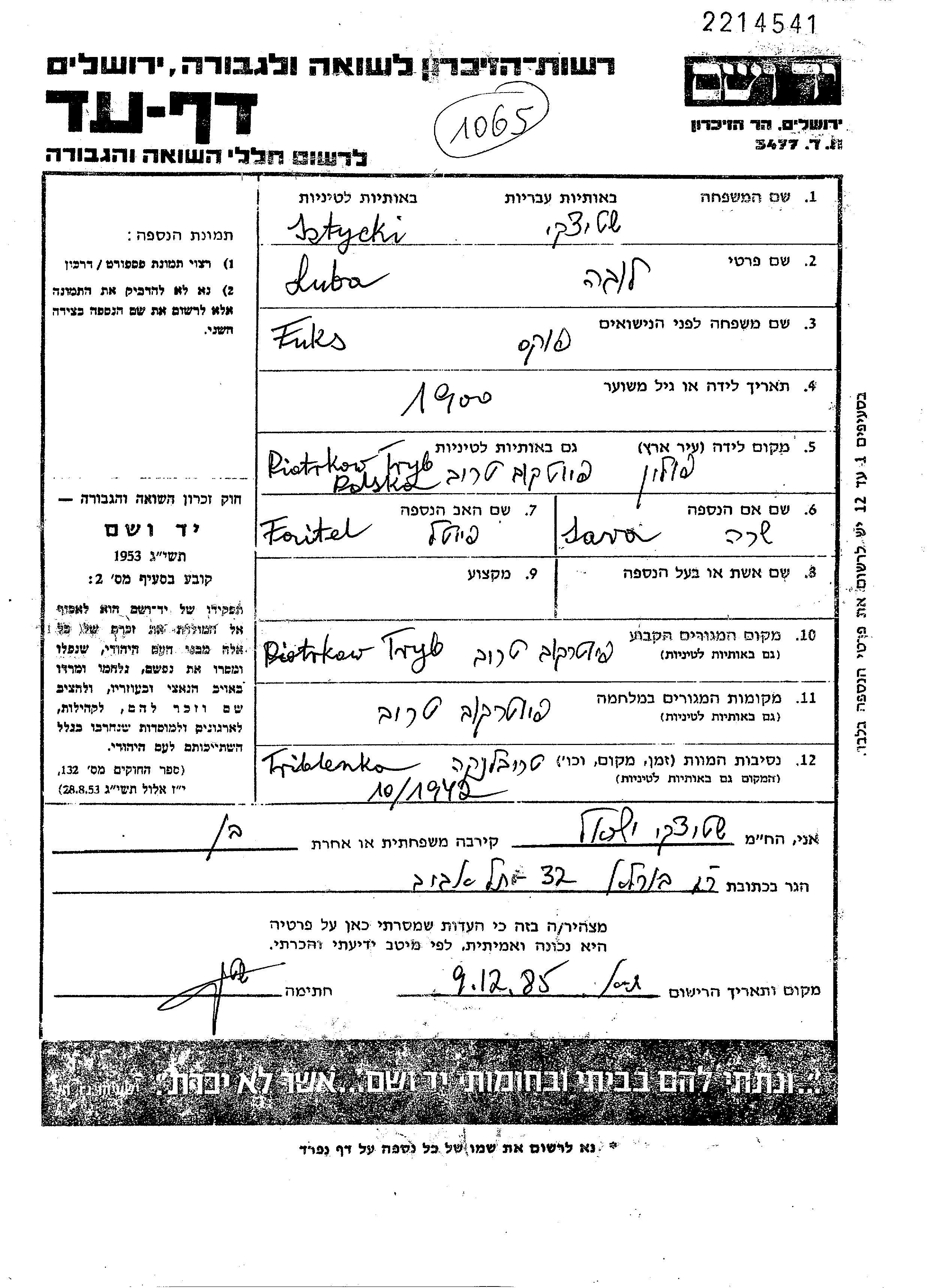 Luba Sztycki, geb. Fuks wurde im Jahr 1900 in Piotrkow Trybunalski, Polen geboren. Sie war die Tochter von Faitel und Sara. Sie war mit Szlomo Verheiratet. Vor dem Zweiten Weltkrieg lebte sie in Piotrkow Trybunalski, Polen. Während des Krieges war sie in Piotrkow Trybunalski, Polen.