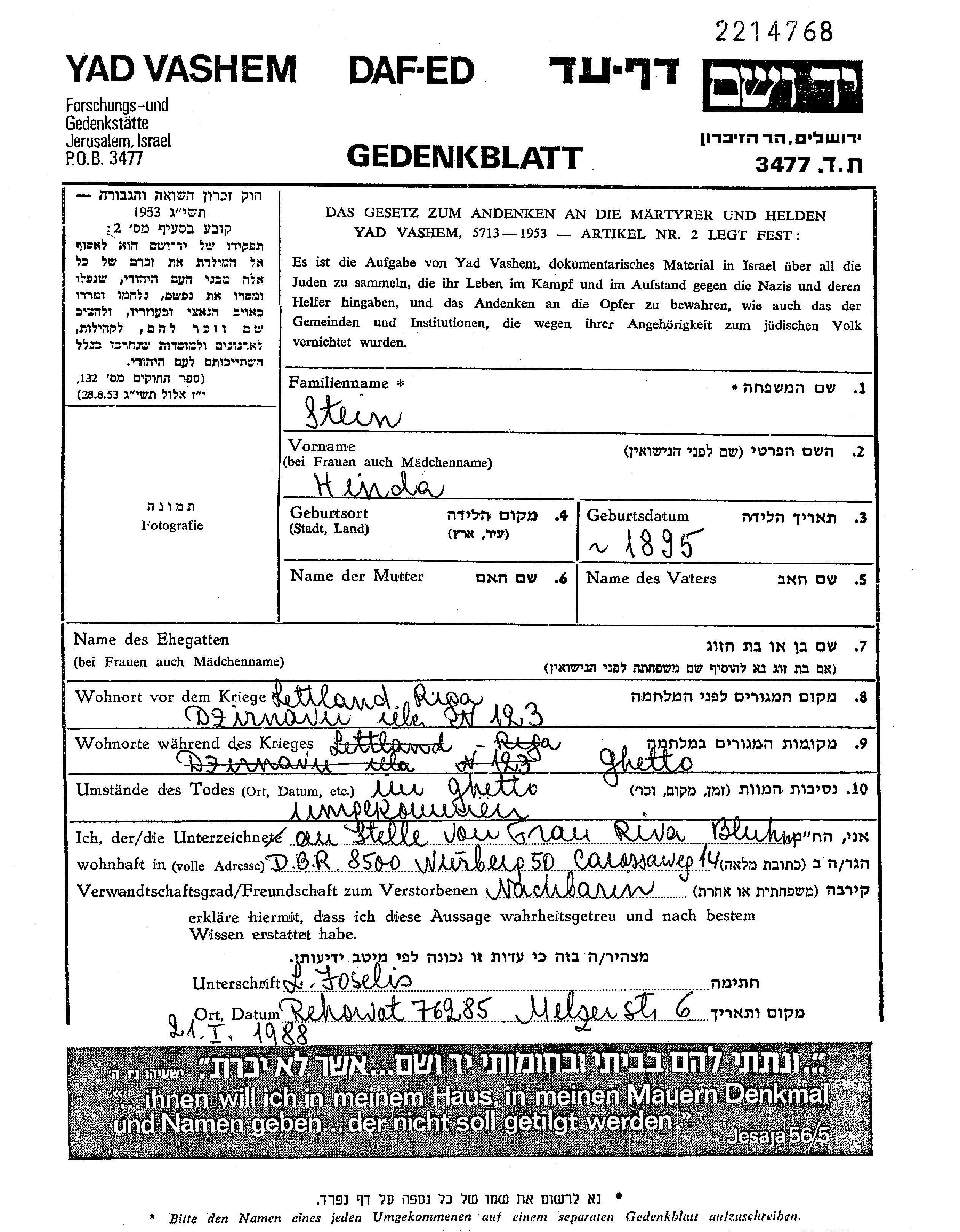 Hinda Stein. Vor dem Zweiten Weltkrieg lebte sie in Riga, Lettland. Während des Krieges war sie in Riga, Lettland.