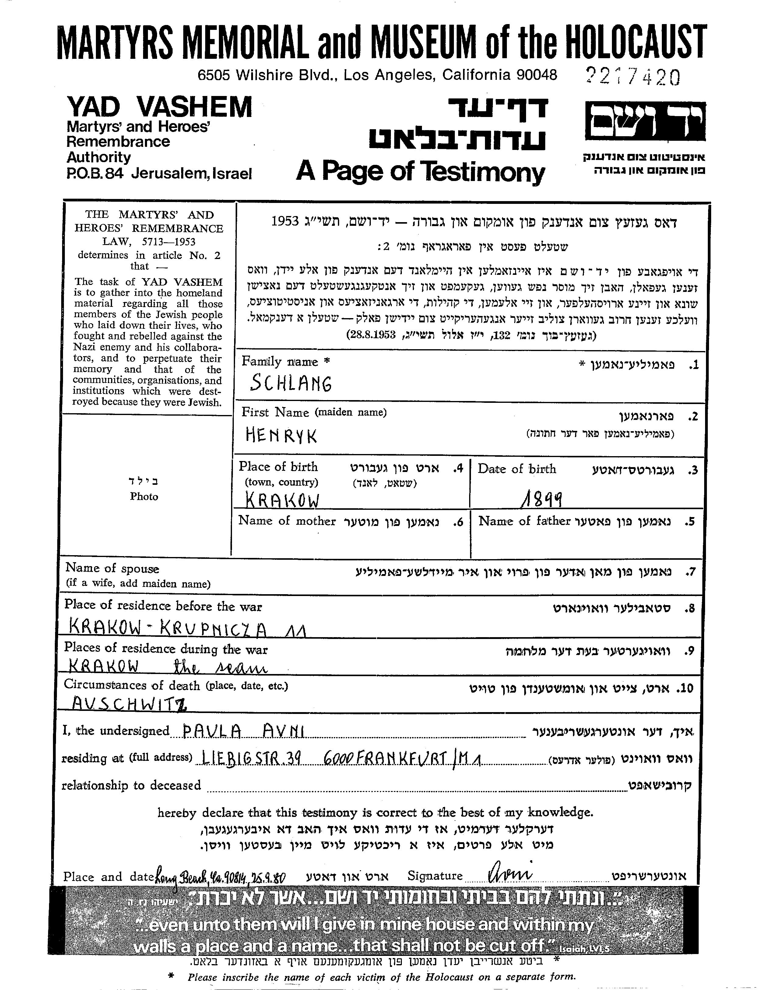 Henryk Schlang wurde in Krakow, Polen geboren. Er war mit Leona Verheiratet. Vor dem Zweiten Weltkrieg lebte er in Krakow, Polen. Während des Krieges war er in Krakow, Polen.