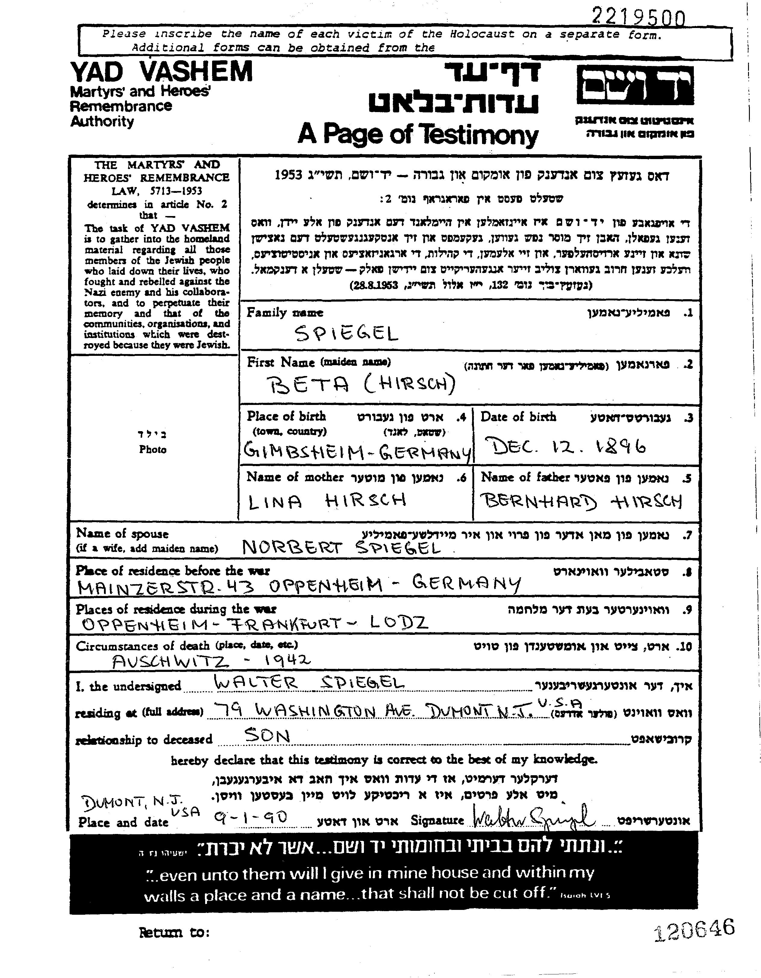 Beta Spiegel, geb. Hirsch wurde im Jahr 1896 in Gimbsheim, Deutsches Reich geboren. Sie war die Tochter von Bernhard und Lina. Sie war mit Norbert Verheiratet. Vor dem Zweiten Weltkrieg lebte sie in Oppenheim, Deutsches Reich. Während des Krieges war sie in Frankfurt Main, Deutsches Reich.