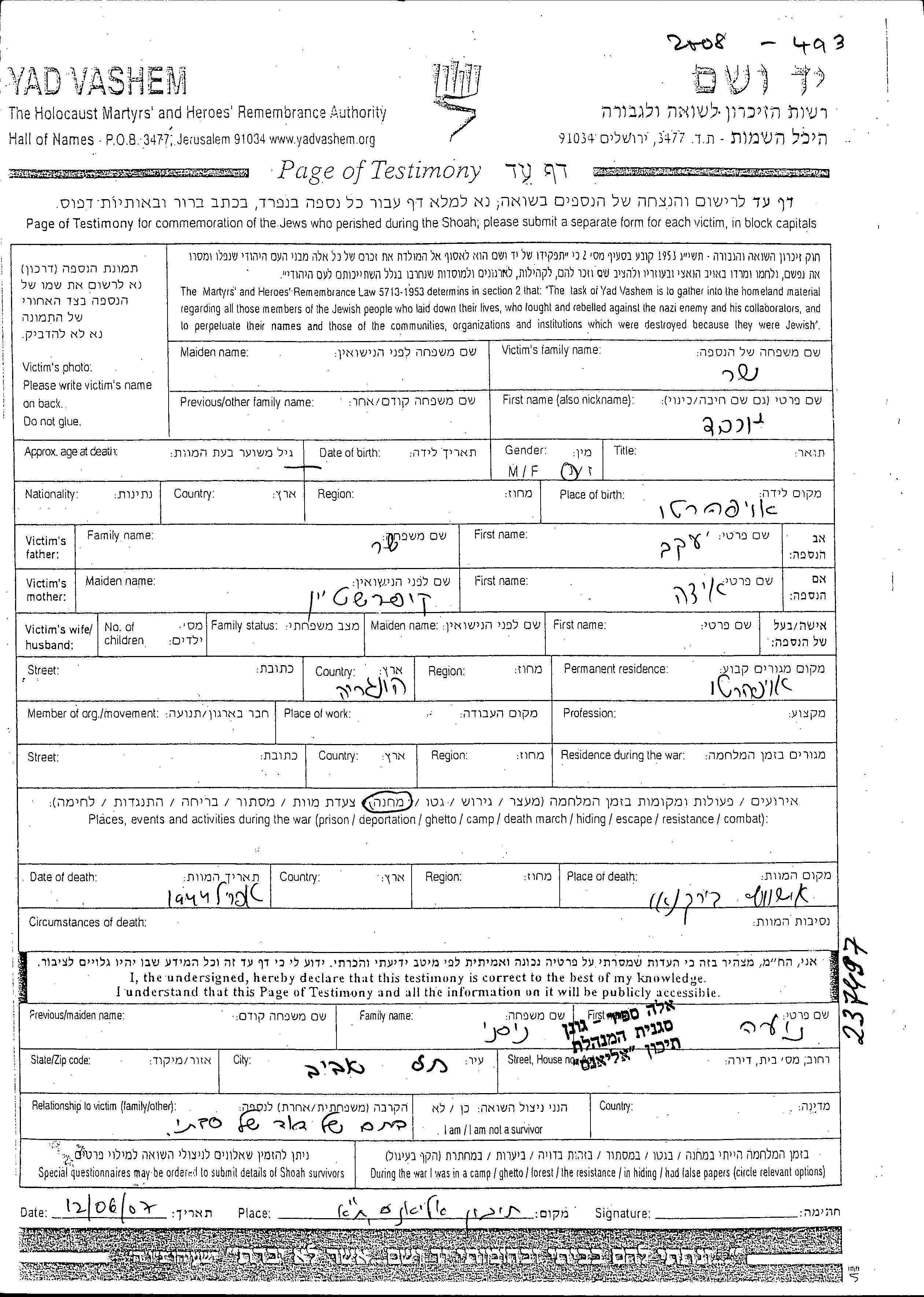 Yokheved wurde in der Schoah ermordet. Todesort: Auschwitz, Polen im Jahr 04/1944.