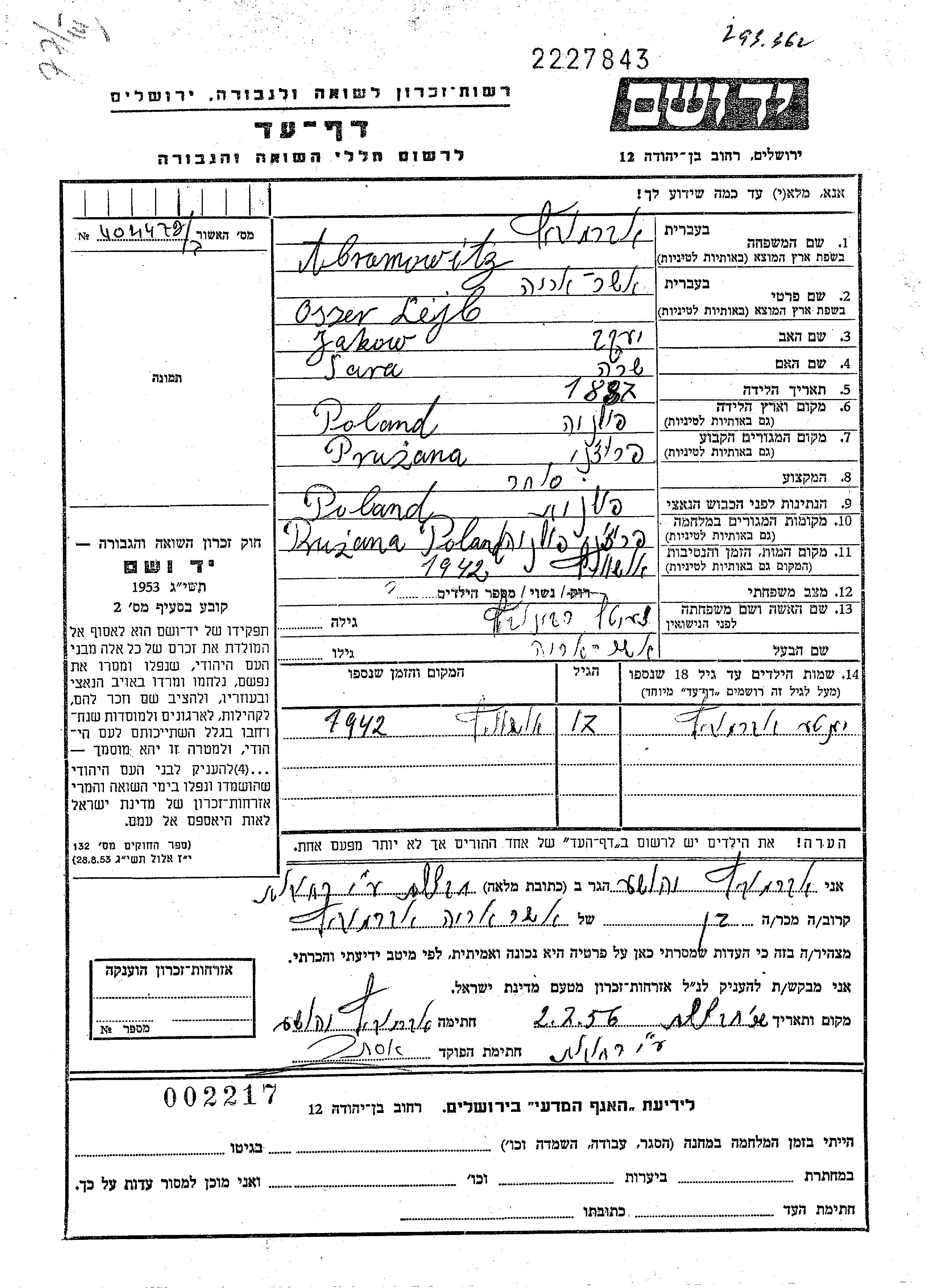 Oszer Lejb Abramowitz wurde im Jahr 1887 in Polen geboren. Er war der Sohn von Jakow und Sara. Er war Kaufmann/-frau und mit Tzeitl Verheiratet. Vor dem Zweiten Weltkrieg lebte er in Pruzana, Polen. Während des Krieges war er in Pruzana, Polen.