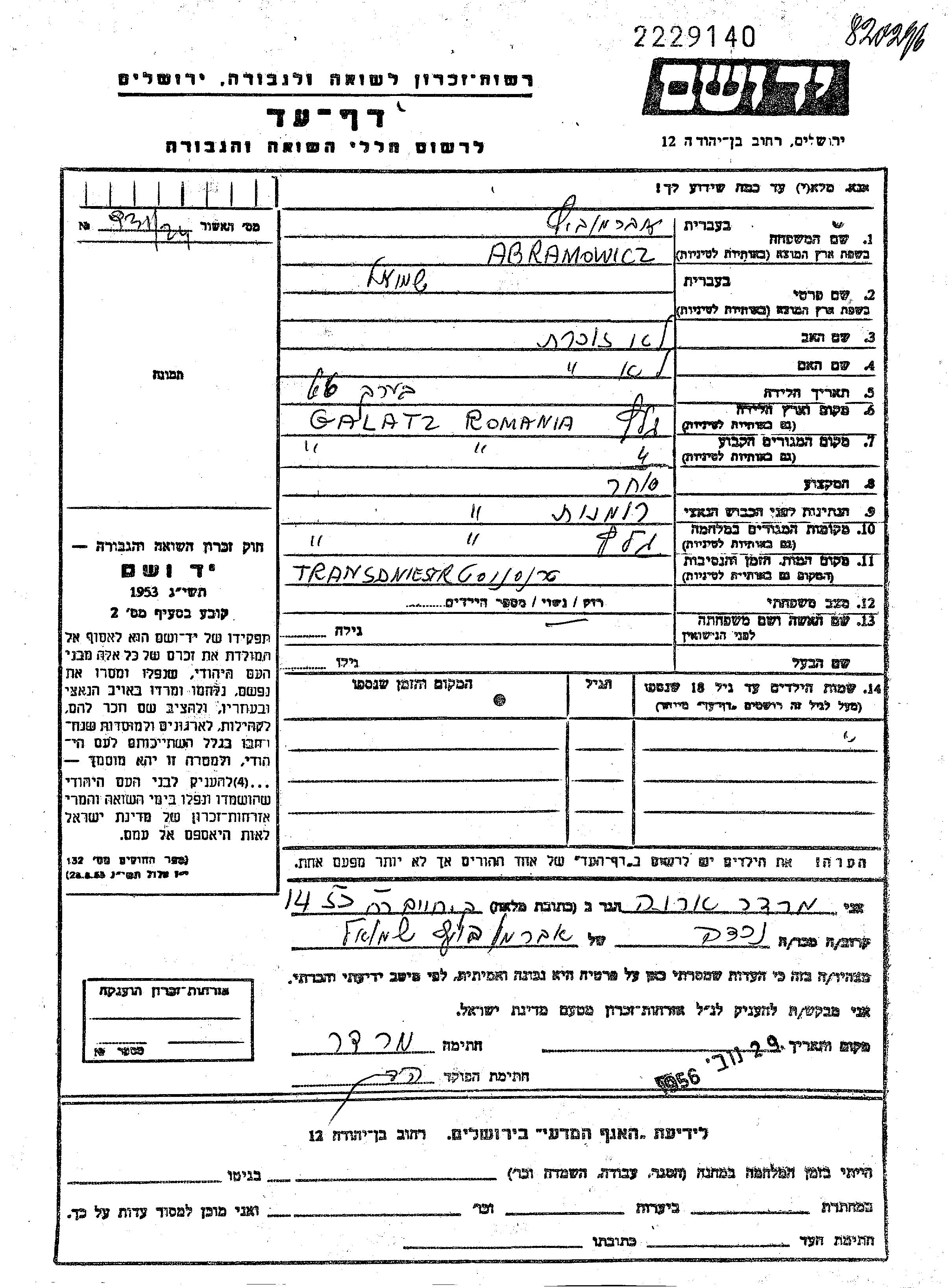 Shmuel Abramowicz wurde in Galatz, Rumänien geboren. Er war Kaufmann/-frau und mit Sara Verheiratet. Vor dem Zweiten Weltkrieg lebte er in Galatz, Rumänien. Während des Krieges war er in Galatz, Rumänien.