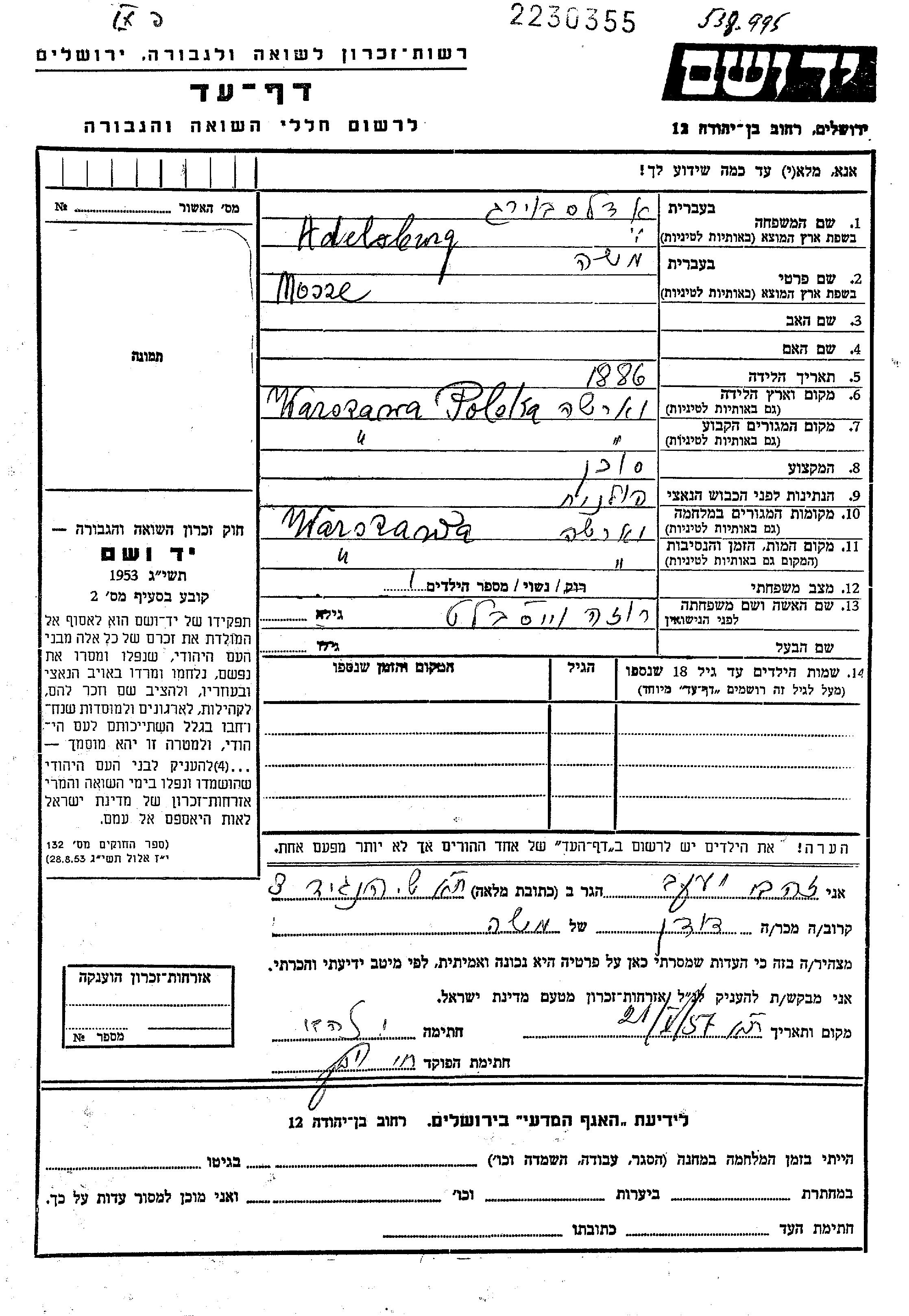 Mosze Adelsburg wurde im Jahr 1886 in Warszawa, Polen geboren. Er war Vertreter/-in und mit Roza Verheiratet. Vor dem Zweiten Weltkrieg lebte er in Warszawa, Polen. Während des Krieges war er in Warszawa, Polen.