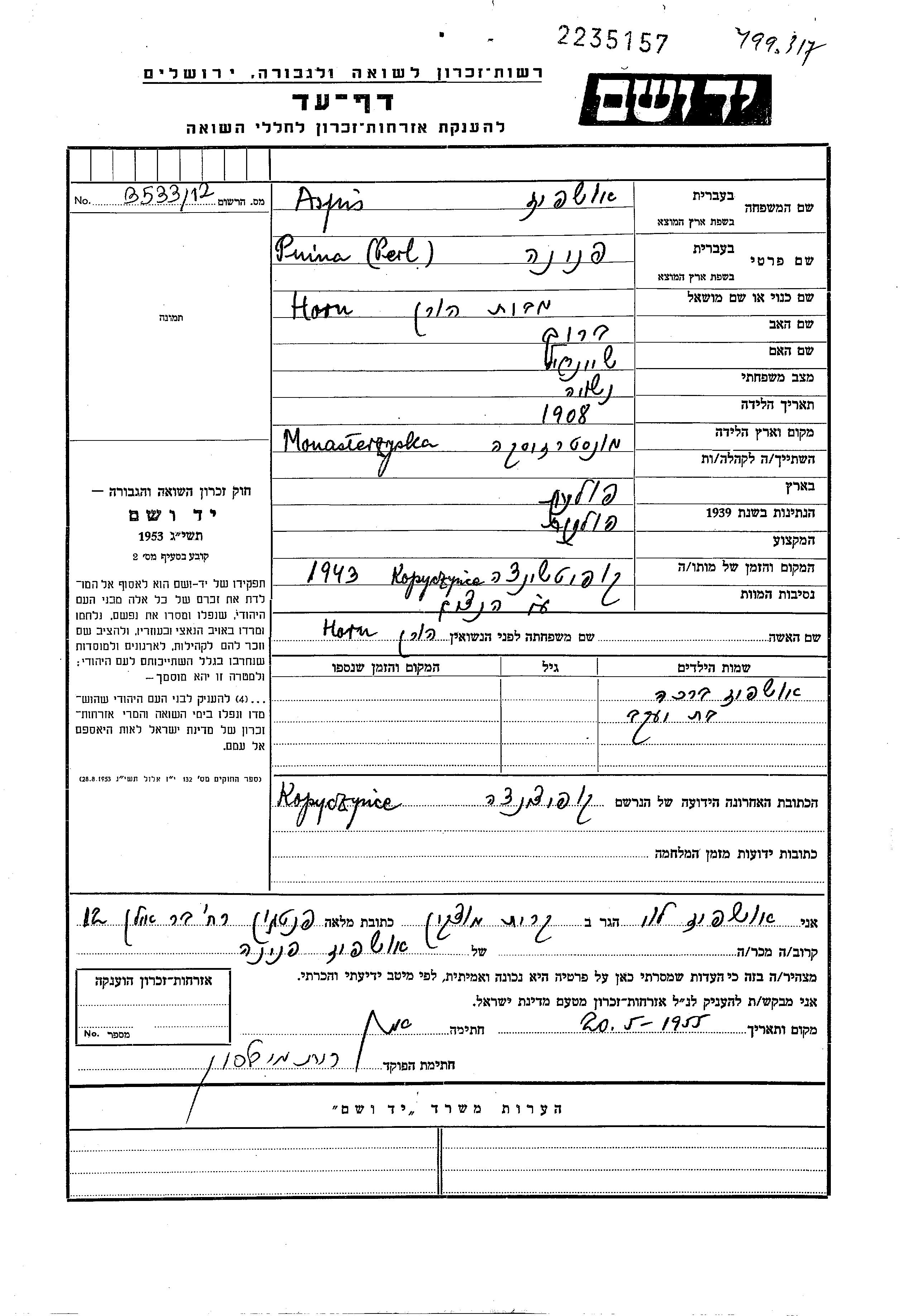 Perl Pnina Aspis Aushpiz, geb. Horn wurde im Jahr 1908 in Monasterzyska, Polen geboren. Sie war die Tochter von Barukh und Sheindl. Sie war mit Yaakov Verheiratet.