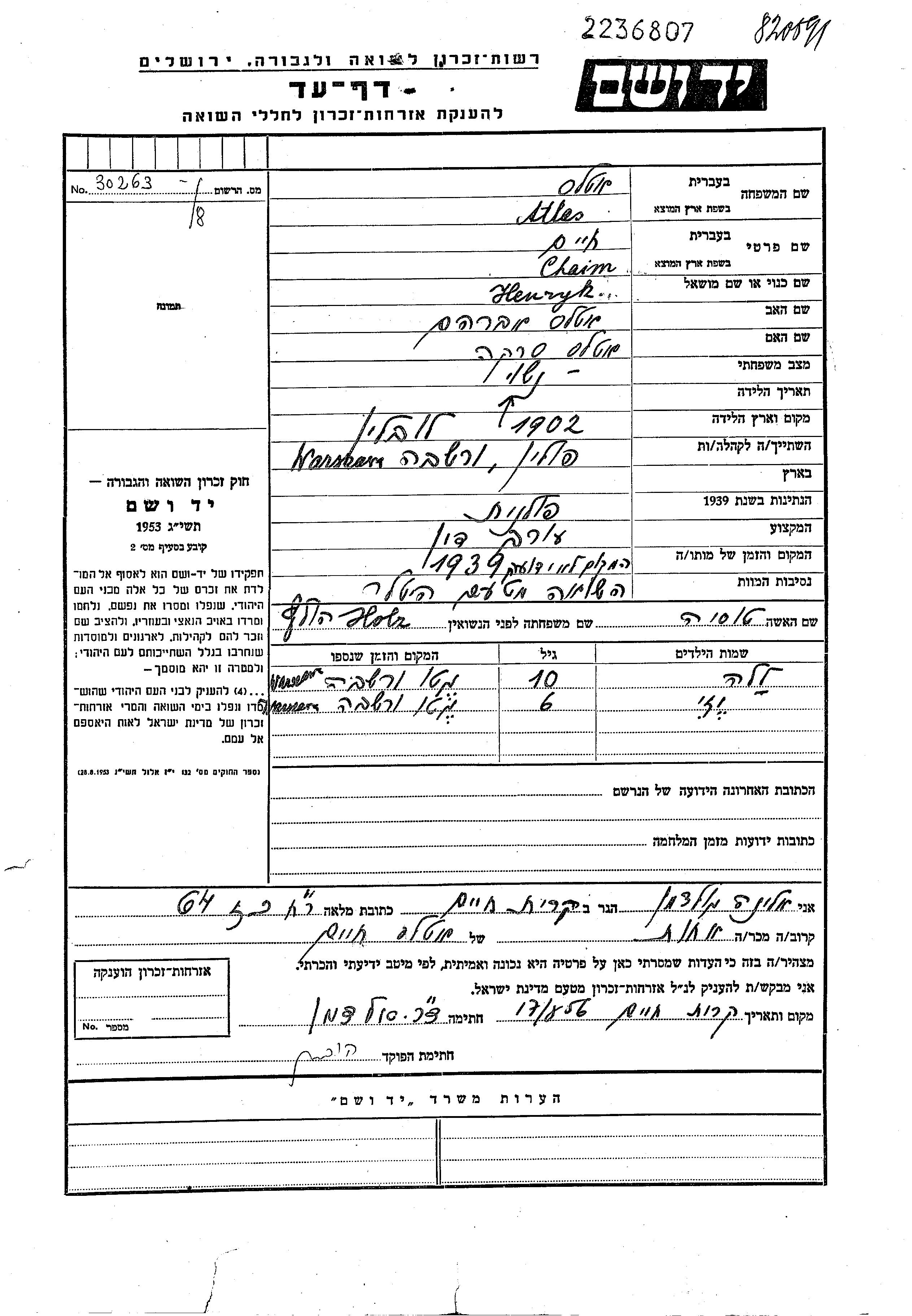 Chaim Henryk Atlas wurde im Jahr 1902 in Lublin, Polen geboren. Er war der Sohn von Abraham und Serka, geb. Lomkowicz. Er war Rechtsanwalt/rechtsanwältin und mit Tosya Verheiratet. Vor dem Zweiten Weltkrieg lebte er in Warszawa, Polen.