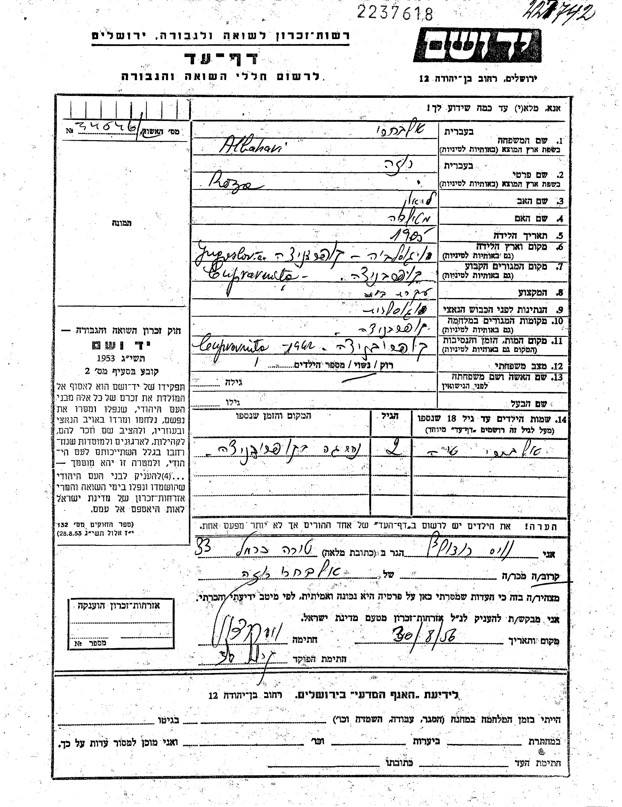 Roza wurde in der Schoah ermordet. Todesort: Koprivnica, Jugoslawien im Jahr 1942.