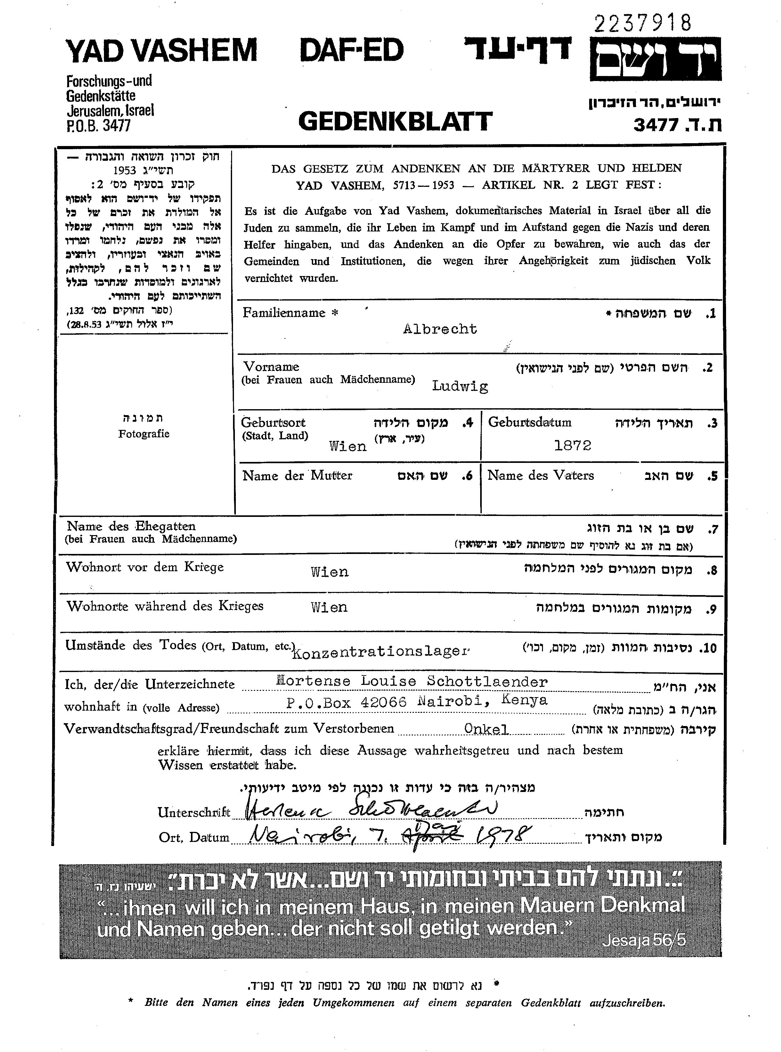 Ludwig Albrecht wurde im Jahr 1872 in Wien, Österreich geboren. Er war mit Melania Verheiratet. Vor dem Zweiten Weltkrieg lebte er in Wien, Österreich. Während des Krieges war er in Wien, Österreich.