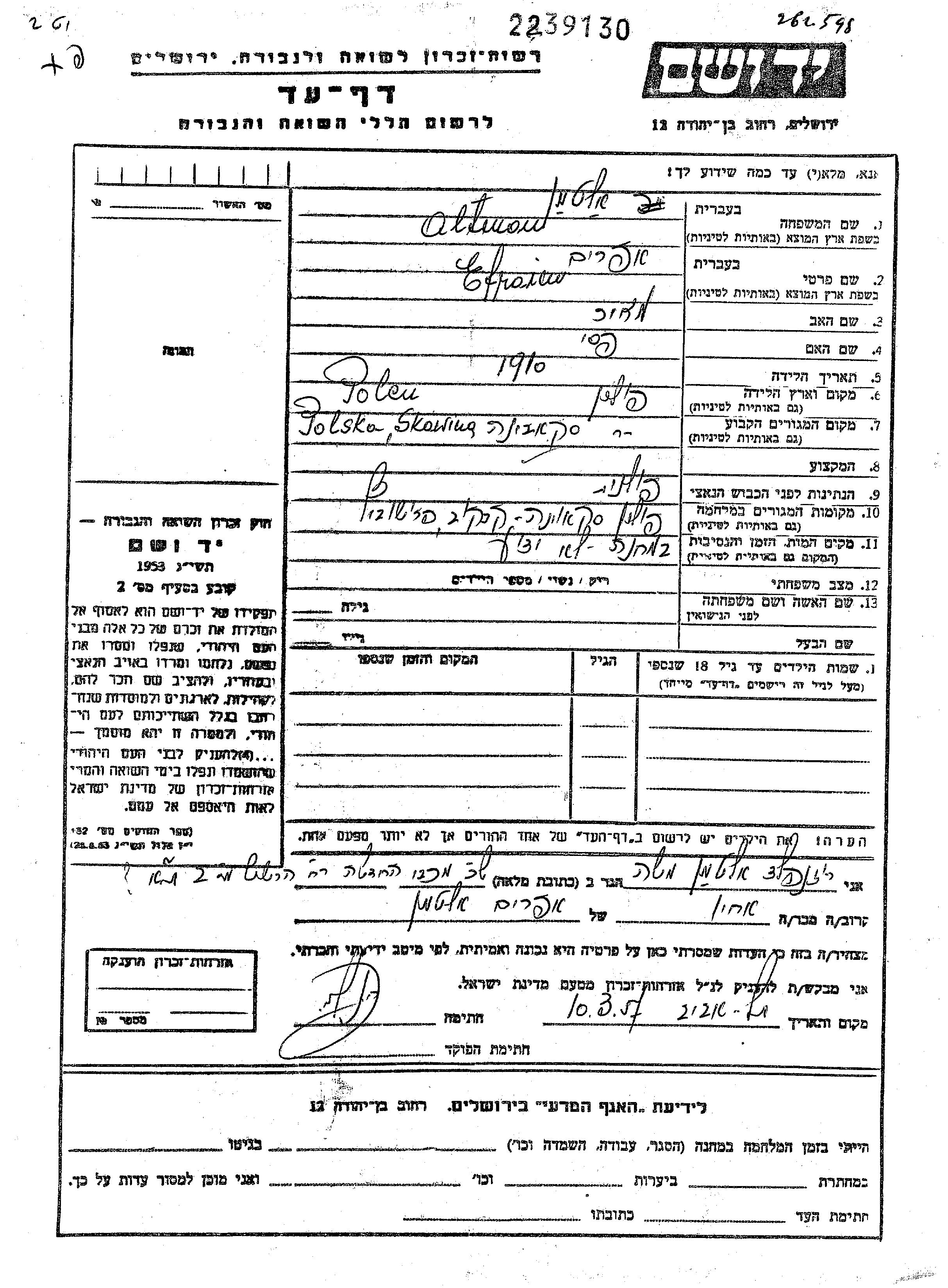 Altman Efraim 1910 Skawina, Polen Gedenkblatt