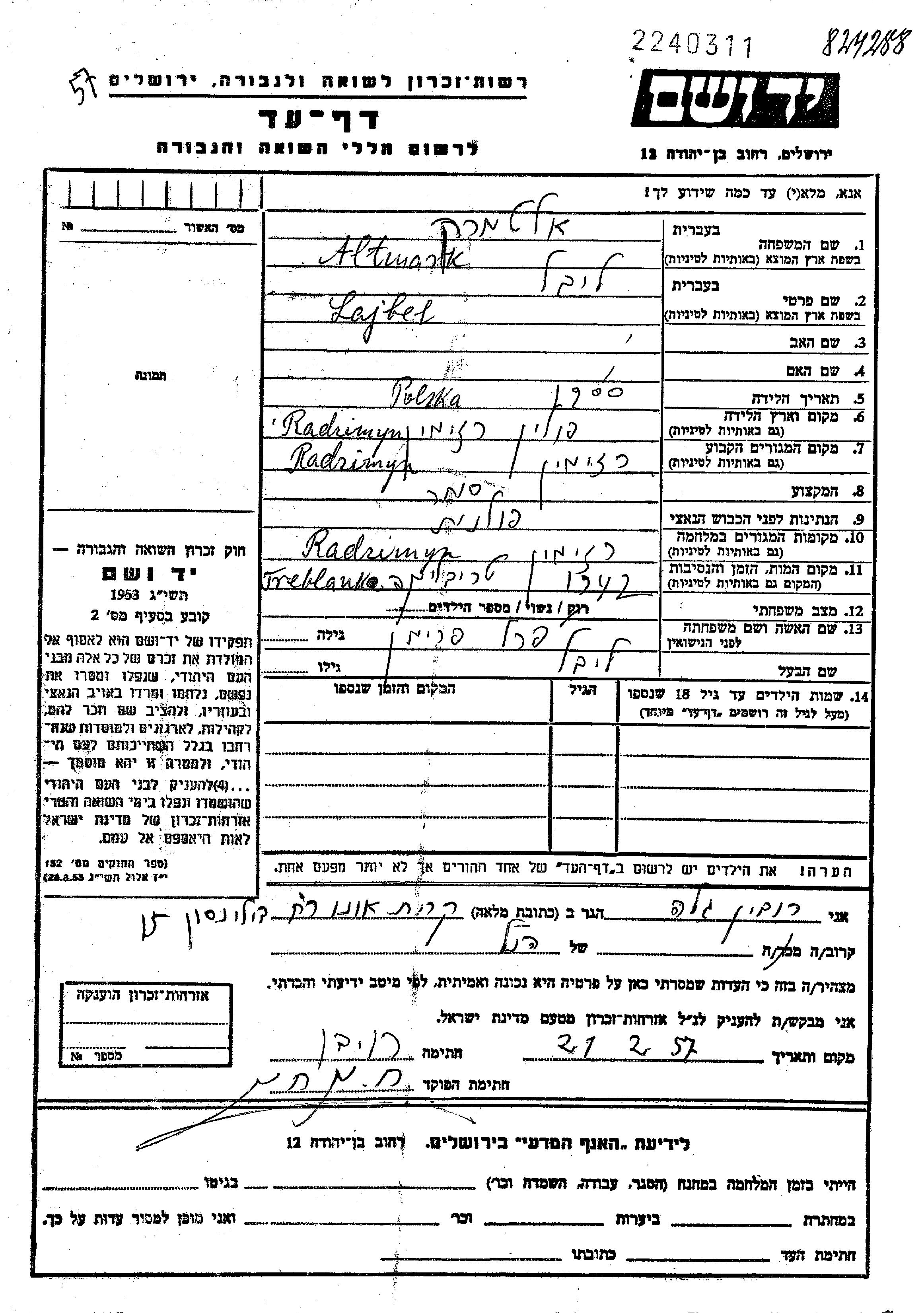 Lajbel Altmark wurde im Jahr 1900 in Radzymin, Polen geboren. Er war Kaufmann/-frau und mit Perl Verheiratet. Vor dem Zweiten Weltkrieg lebte er in Radzymin, Polen. Während des Krieges war er in Radzymin, Polen.