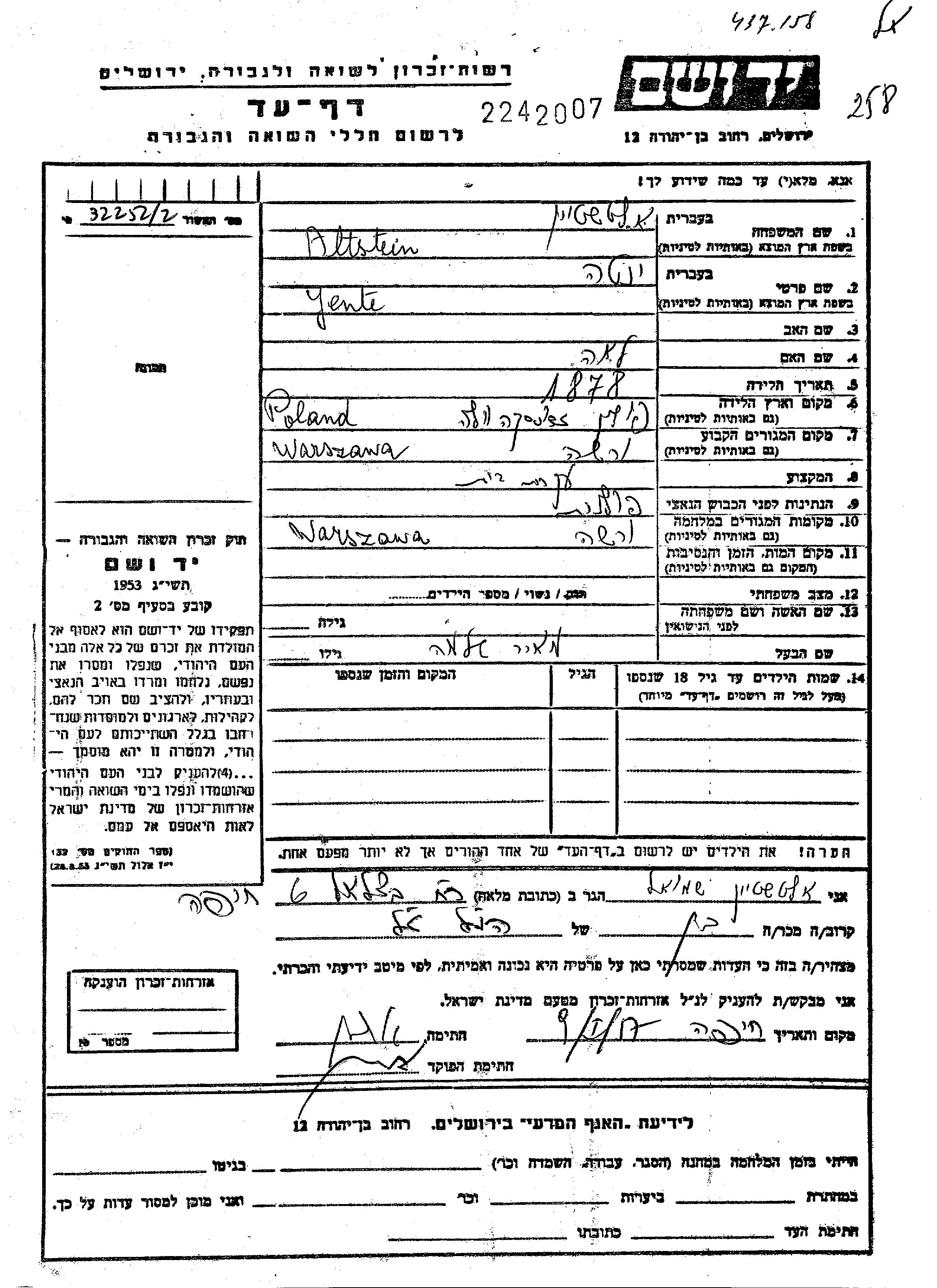Yente Altstein, geb. Sobel wurde im Jahr 1878 in Zdunska Wola, Polen geboren. Sie war die Tochter von Lea. Sie war Hausfrau und mit Meir Shlomo Verheiratet. Vor dem Zweiten Weltkrieg lebte sie in Warszawa, Polen. Während des Krieges war sie in Warszawa, Polen.