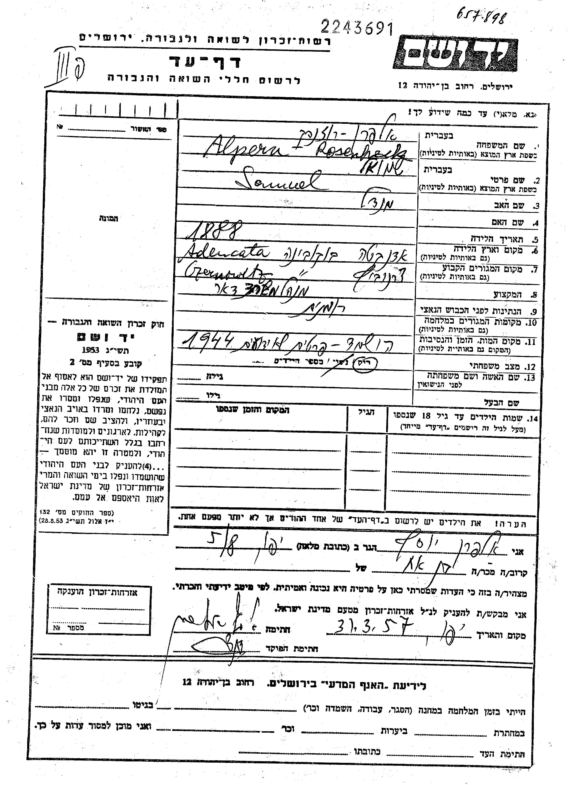 Shmuel Alpern Rosenheck Elpern wurde im Jahr 1888 in Adancata, Rumänien geboren. Er war der Sohn von Mendel. Er war Postdirektor und Ledig. Vor dem Zweiten Weltkrieg lebte er in Czernowitz, Rumänien.