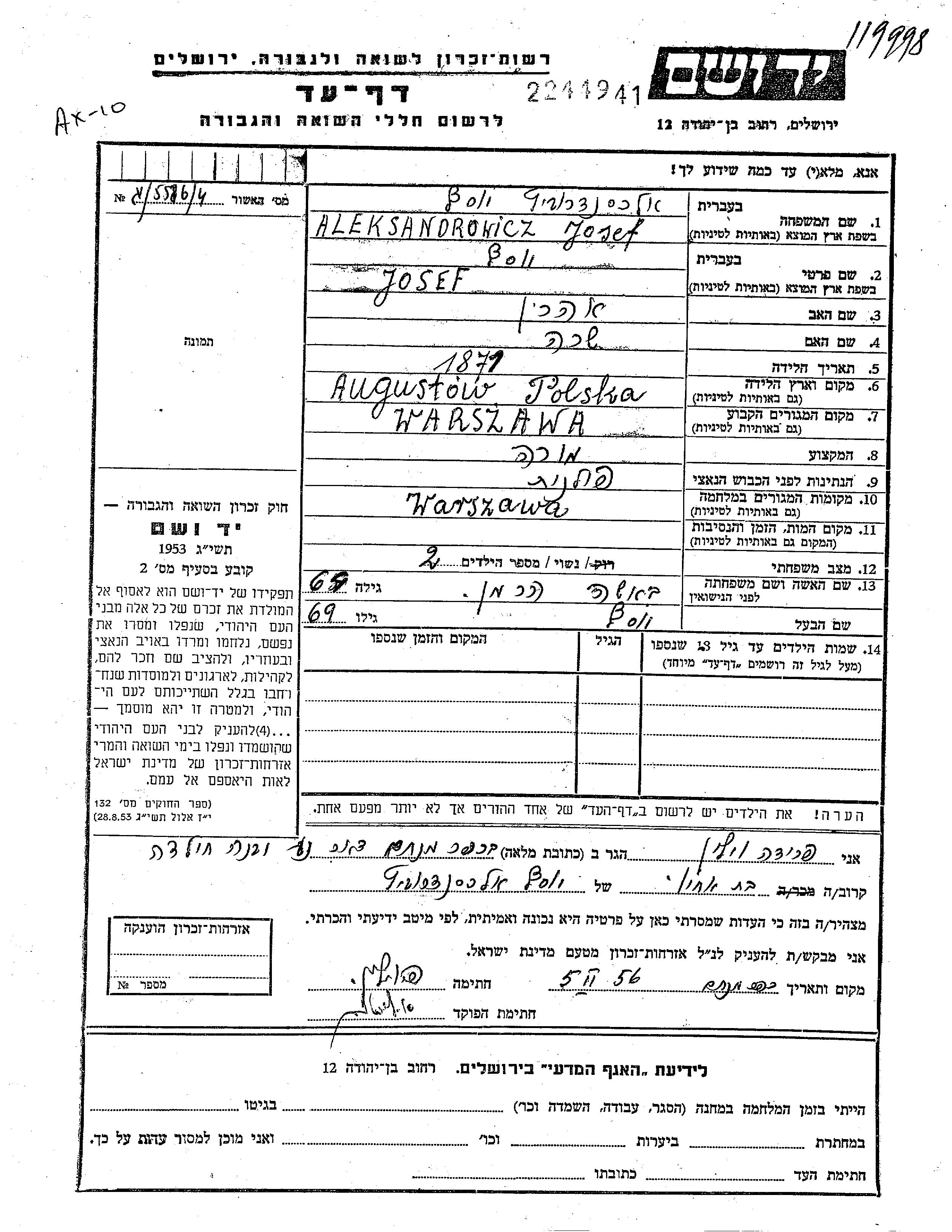 Josef Aleksandrowicz wurde im Jahr 1871 in Augustów, Polen geboren. Er war der Sohn von Aharon und Sara. Er war Lehrer/in und mit Sasha Basha Verheiratet. Vor dem Zweiten Weltkrieg lebte er in Warszawa, Polen. Während des Krieges war er in Warszawa, Polen.