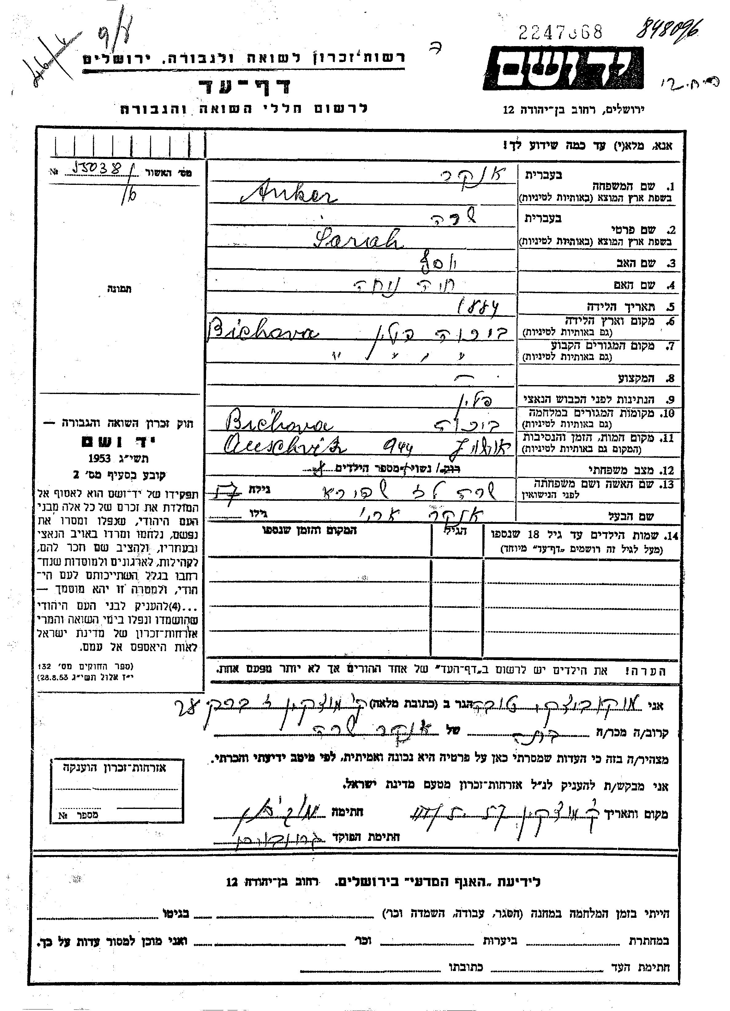 Sarah Anker, geb. Spira wurde im Jahr 1887 in Bychawa, Polen geboren. Sie war die Tochter von Yosef und Nekhama Khaia. Sie war mit Arie Leib Verheiratet. Vor dem Zweiten Weltkrieg lebte sie in Bychawa, Polen. Während des Krieges war sie in Bychawa, Polen.