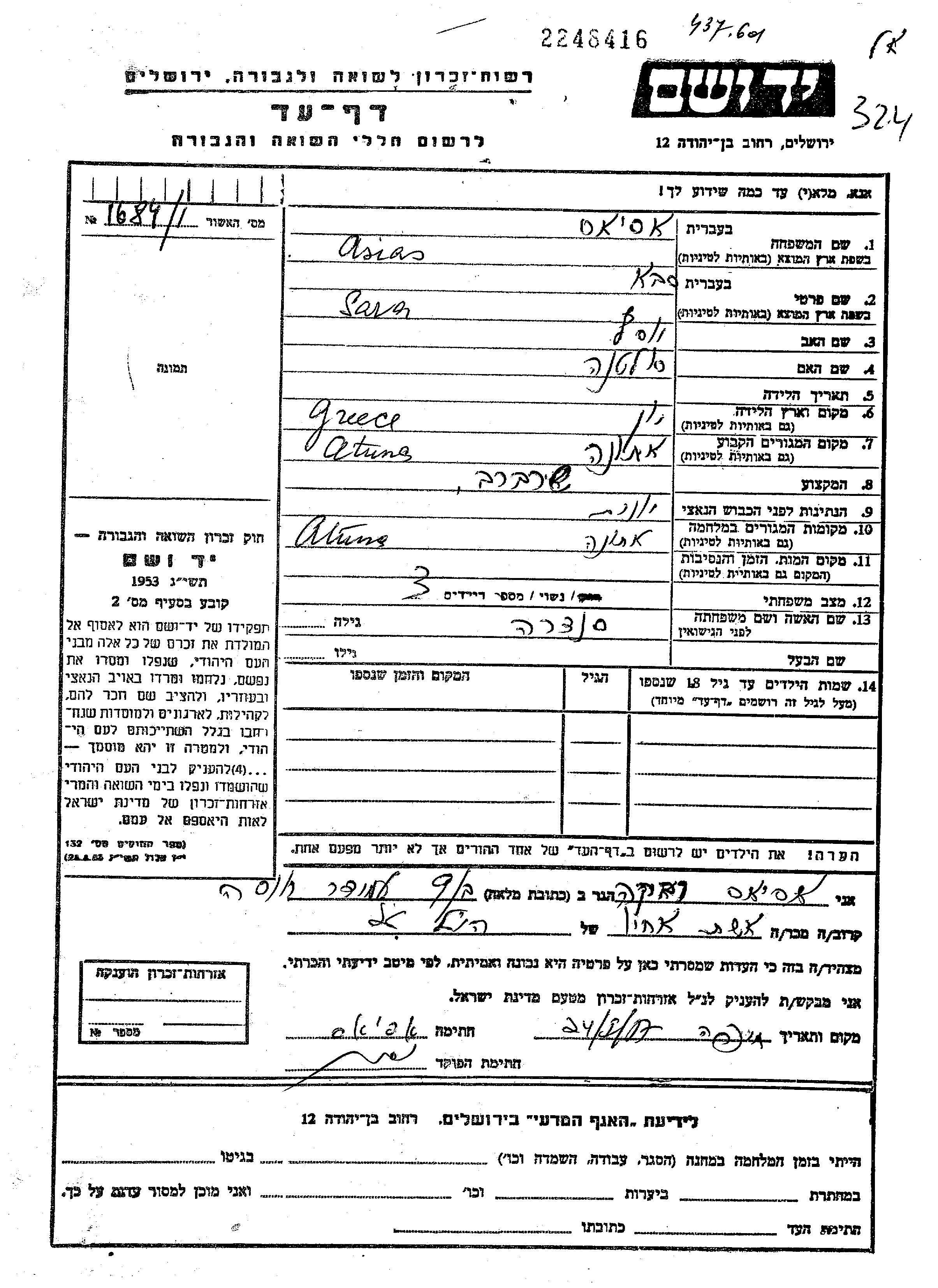 Sava Saba Asias wurde in Griechenland geboren. Er war der Sohn von Yosef und Sultana. Er war Klempner und mit Sandra Verheiratet. Vor dem Zweiten Weltkrieg lebte er in Athens, Griechenland. Während des Krieges war er in Athens, Griechenland.