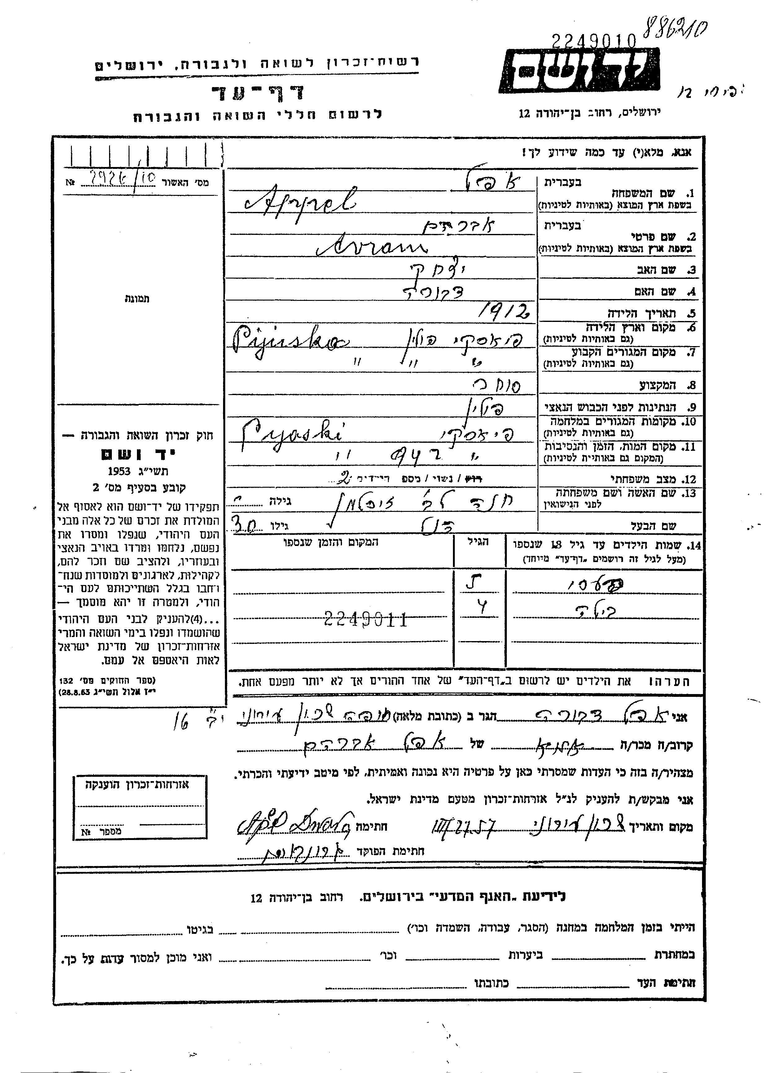 Pesi Appel wurde im Jahr 1937 in Piaski, Polen geboren. Sie war die Tochter von Avram und Chana, geb. Ziselman. Sie war Kind. Vor dem Zweiten Weltkrieg lebte sie in Piaski, Polen. Während des Krieges war sie in Piaski, Polen.