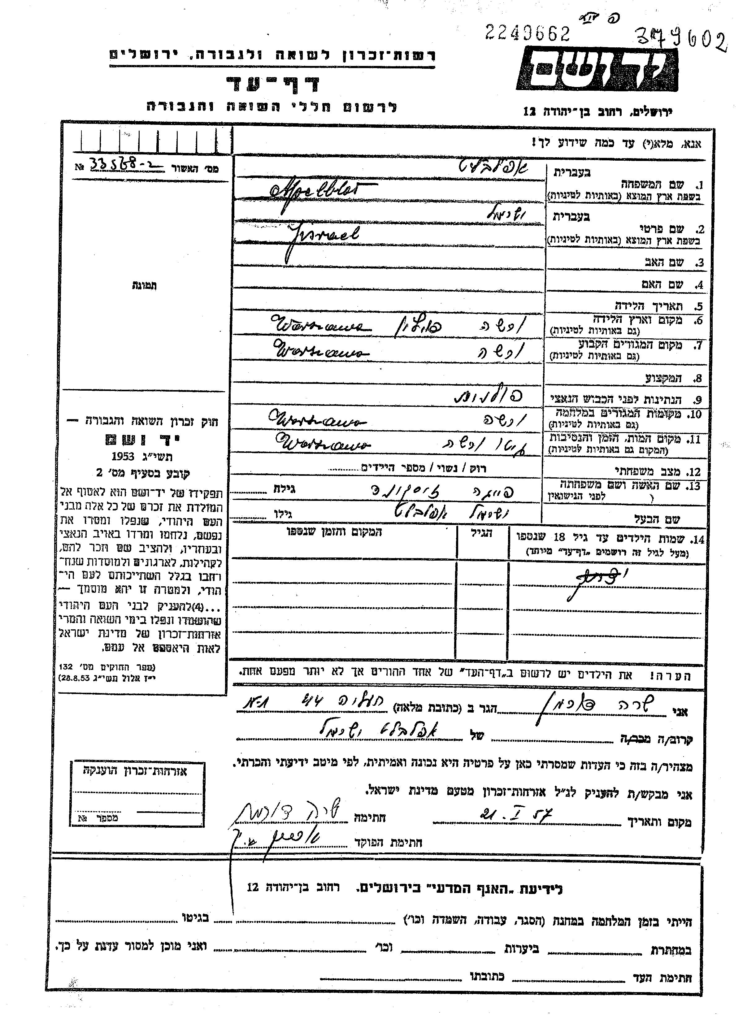 Apelblat Israel Warszawa, Polen Gedenkblatt
