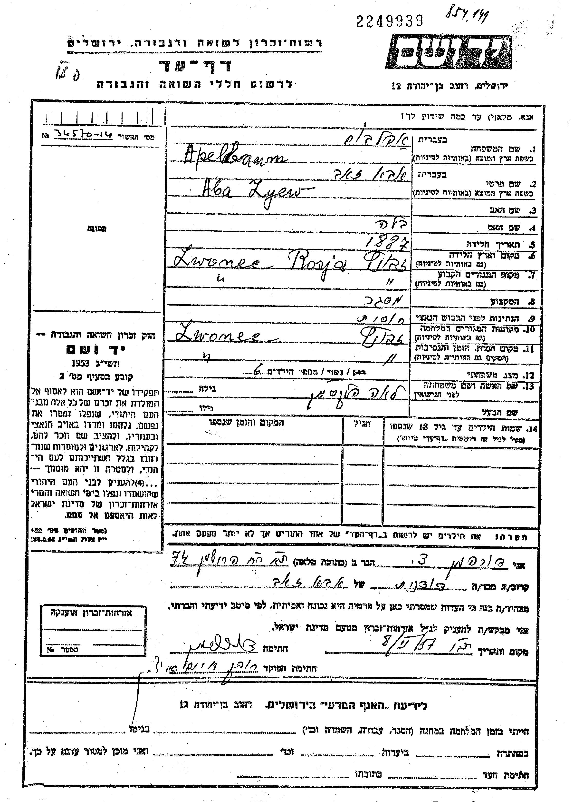 Zyew Aba Apelbom wurde im Jahr 1887 in Zwaniec, Ukraine (UdSSR) geboren. Er war der Sohn von Bela. Er war Schlosser und mit Lea Verheiratet. Vor dem Zweiten Weltkrieg lebte er in Zwaniec, Ukraine (UdSSR). Während des Krieges war er in Zwaniec, Ukraine (UdSSR).