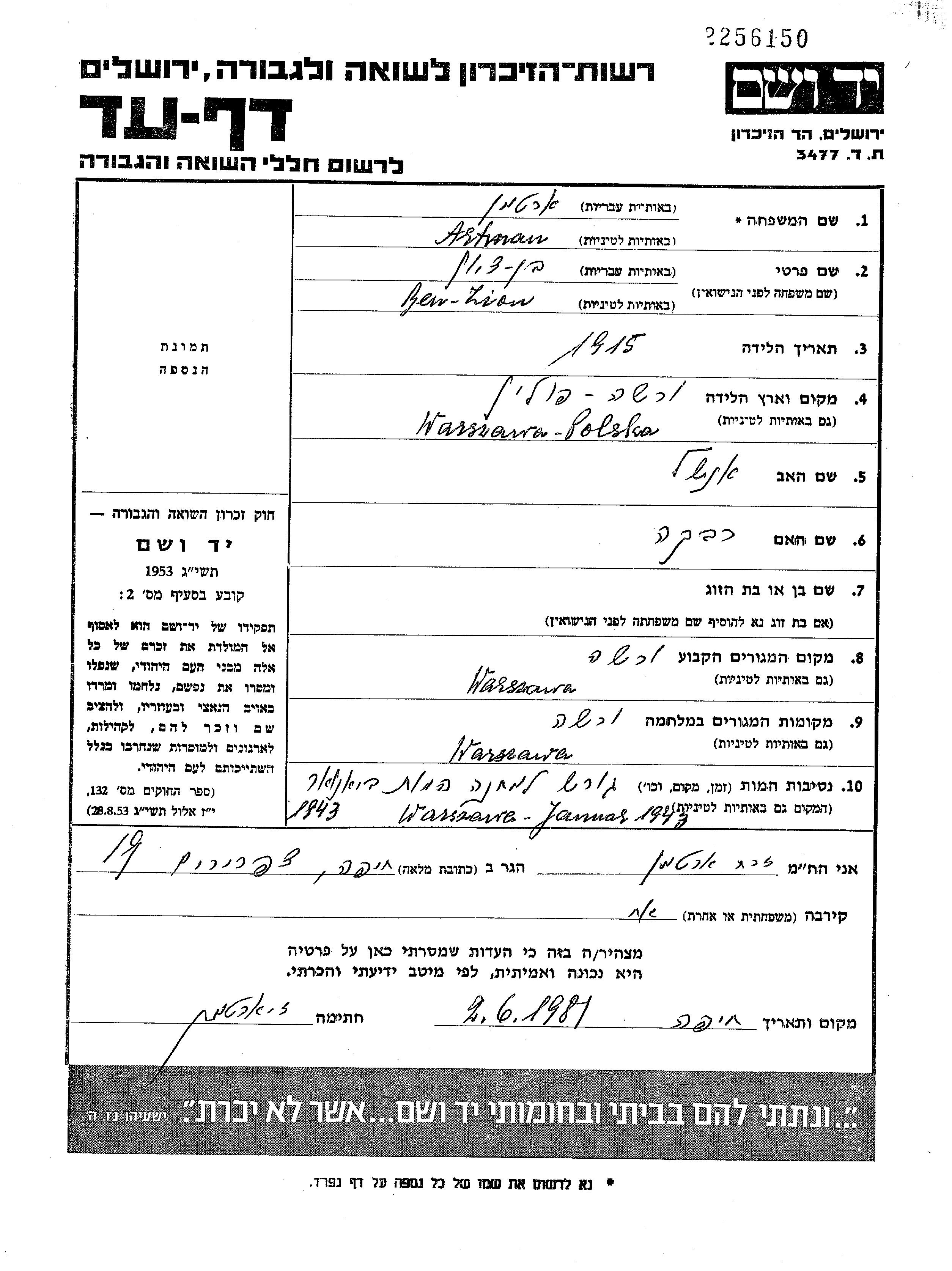 Ben Zion Artman wurde im Jahr 1915 in Warszawa, Polen geboren. Er war der Sohn von Anshel und Rivka, geb. Klinger. Vor dem Zweiten Weltkrieg lebte er in Warszawa, Polen. Während des Krieges war er in Warszawa, Polen.