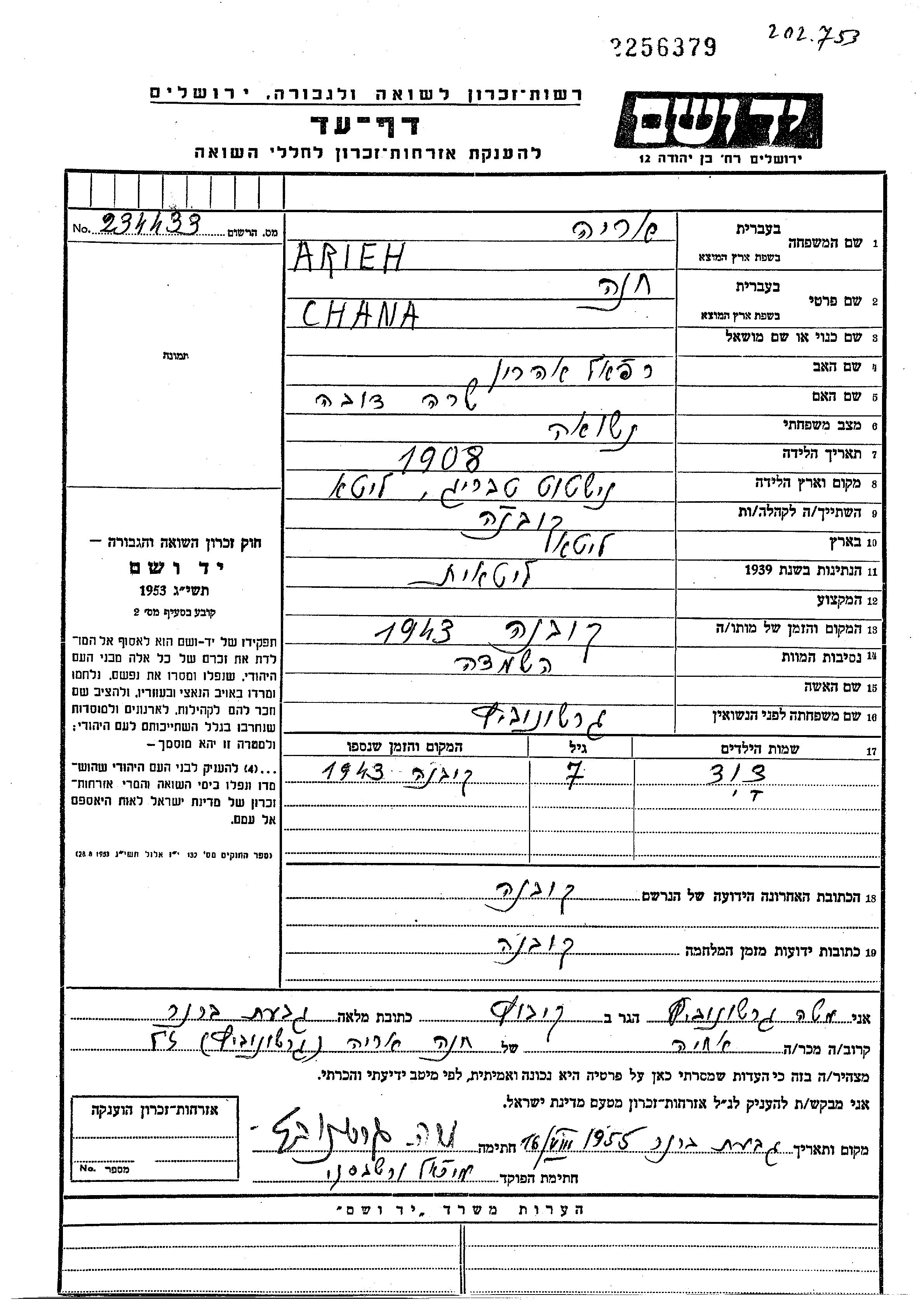 Chana Arieh, geb. Gershonovitz wurde im Jahr 1908 in Tavrig, Litauen geboren. Sie war die Tochter von Rafael Aharon und Doba Sara. Sie war Verheiratet. Vor dem Zweiten Weltkrieg lebte sie in Kowno, Litauen. Während des Krieges war sie in Kowno, Litauen.
