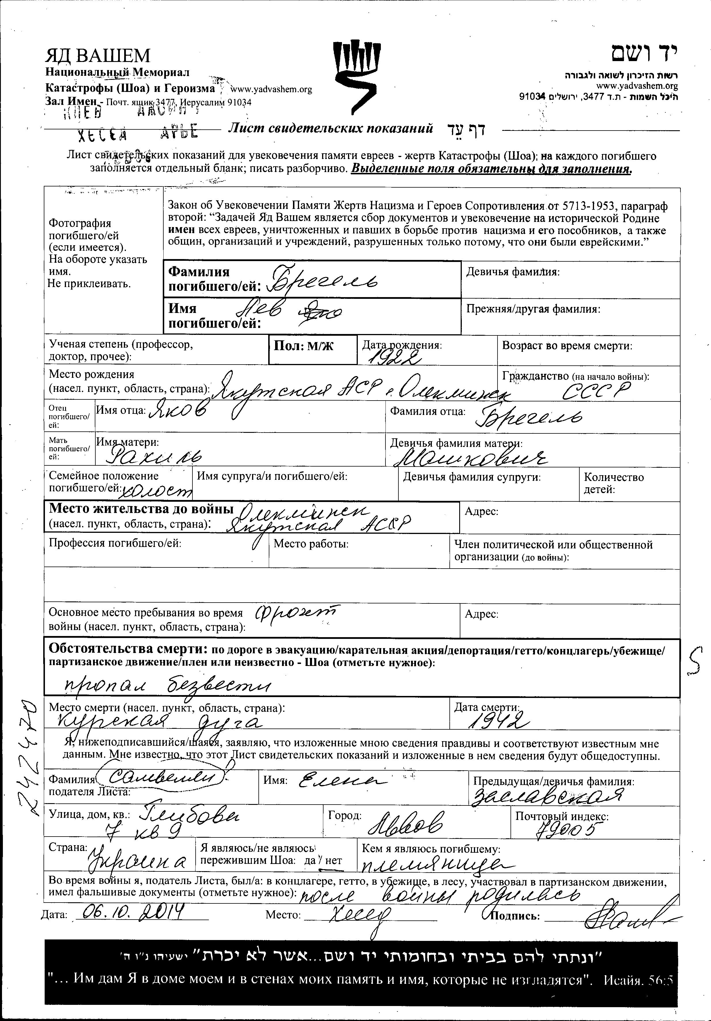 Lev wurde in der Schoah ermordet. Todesort: Kurskaya Duga, Russland (UdSSR) im Jahr 1942.