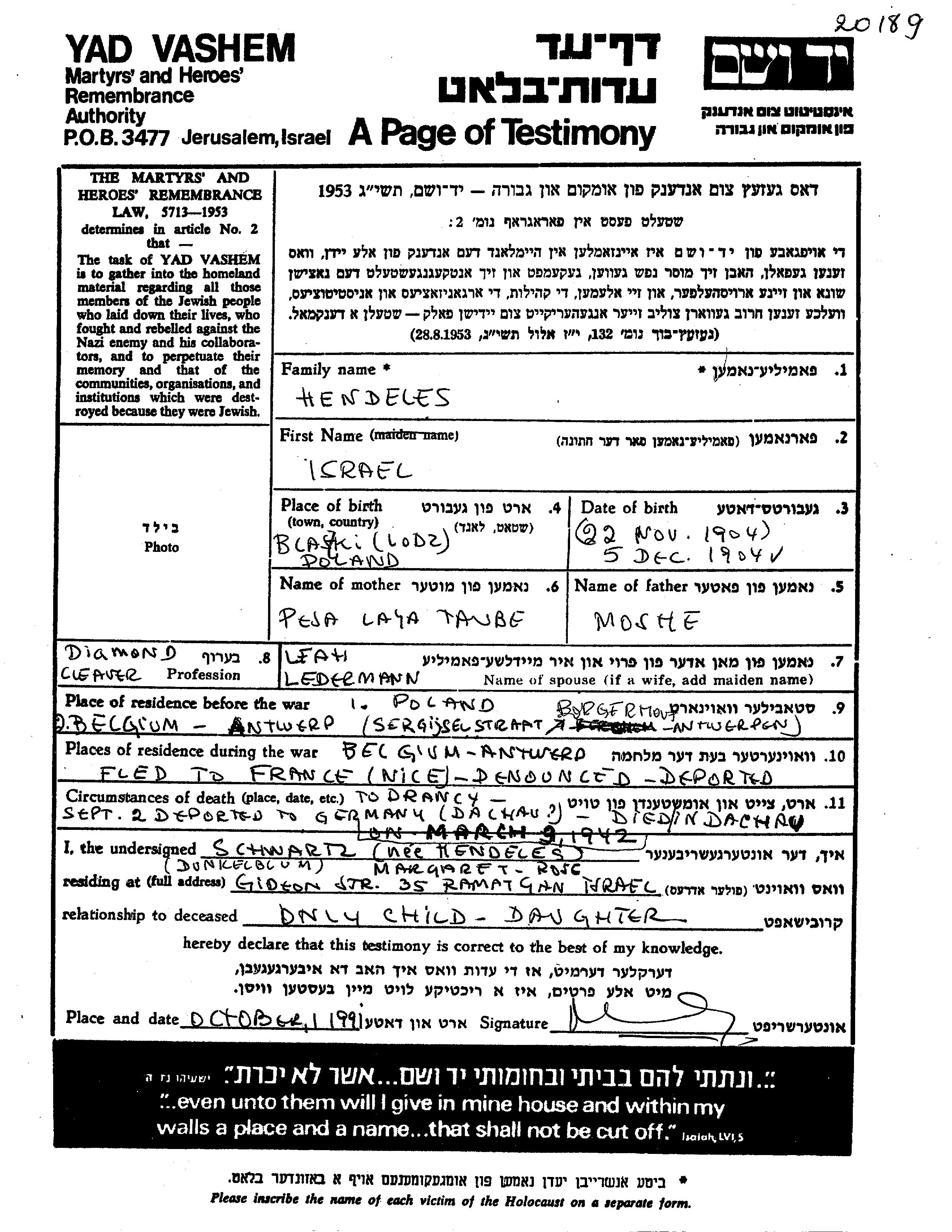 | Hendeles | Israel | 1904 | Blaszki, Polen | Verfolgtenliste |