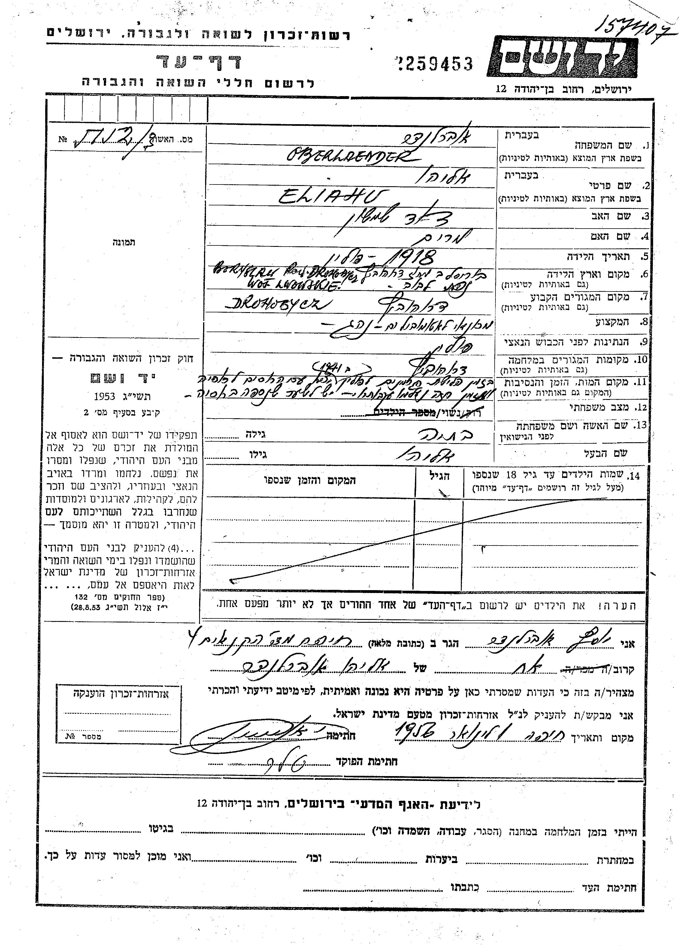 Eliahu Oberlander wurde im Jahr 1918 in Boryslaw, Polen geboren. Er war der Sohn von Dawid Shimshon und Miriam. Er war Mechaniker/-in und mit Batia Verheiratet. Vor dem Zweiten Weltkrieg lebte er in Drohobycz, Polen. Während des Krieges war er in Drohobycz, Polen.