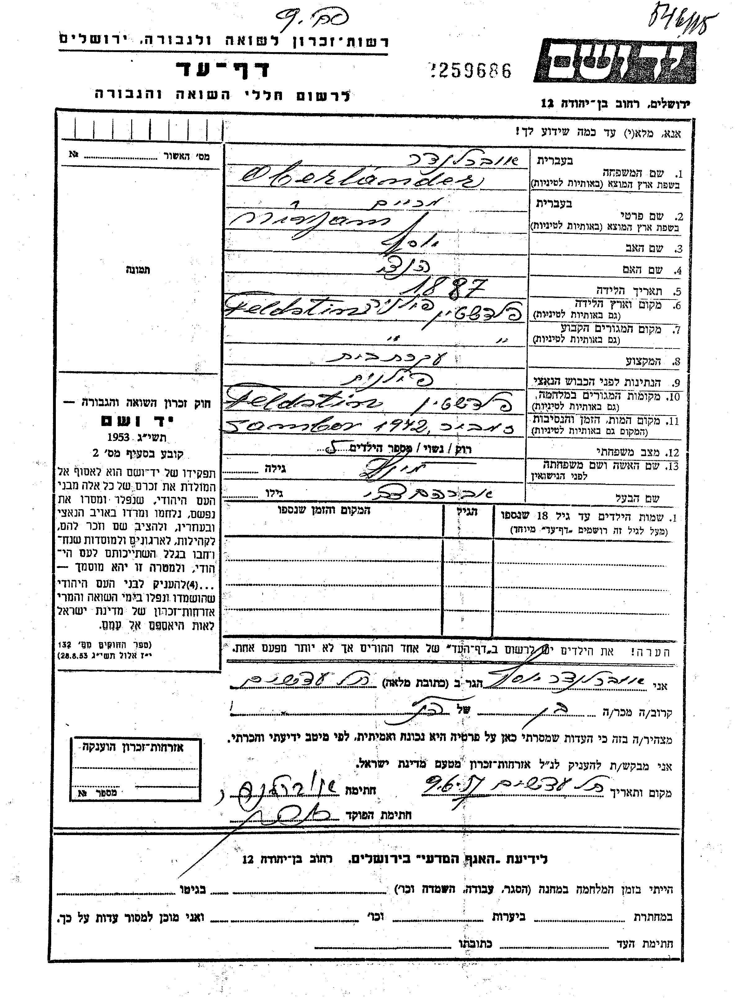 Miriam Oberländer, geb. Mintz wurde im Jahr 1887 in Felsztin, Polen geboren. Sie war die Tochter von Yosef und Hentzi. Sie war Hausfrau und Verheiratet. Vor dem Zweiten Weltkrieg lebte sie in Felsztin, Polen. Während des Krieges war sie in Felsztin, Polen.