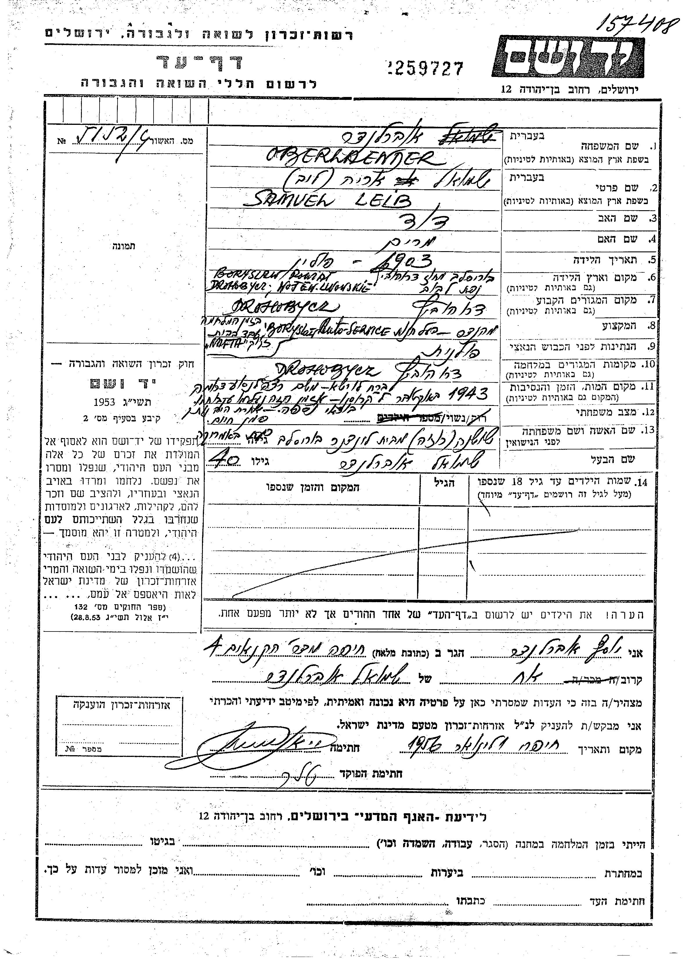 Shmuel Leib Arie Oberländer wurde im Jahr 1903 in Boryslaw, Polen geboren. Er war der Sohn von Dawid und Miriam, geb. Frid. Er war Ingenieur und mit Shoshana Roza Verheiratet. Vor dem Zweiten Weltkrieg lebte er in Drohobycz, Polen. Während des Krieges war er in Krosno, Polen.