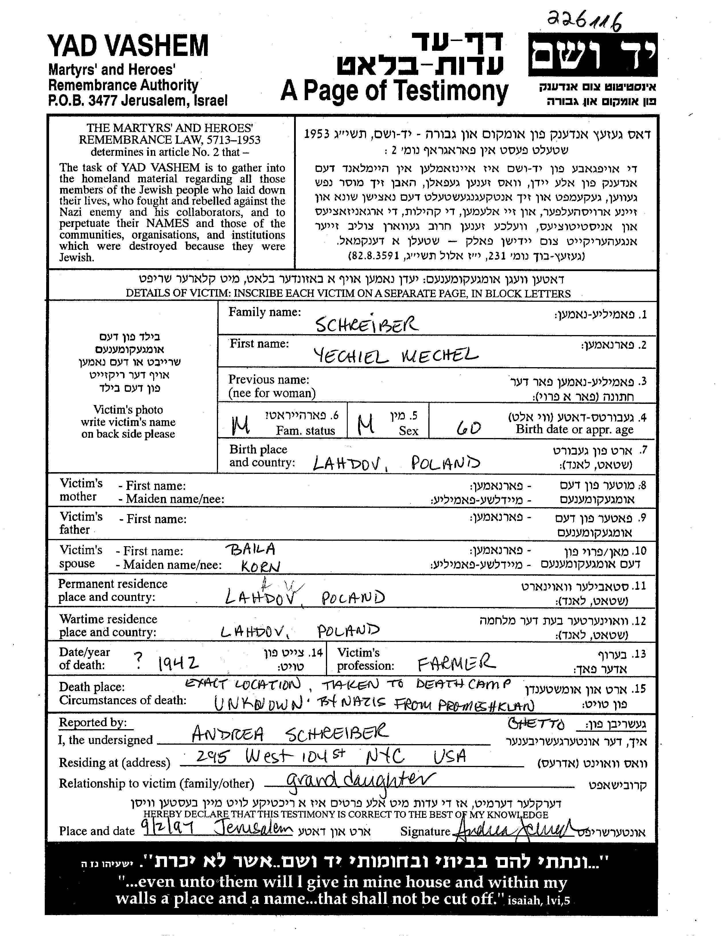 Yechiel Mechel Schreiber wurde im Jahr 1882 in Lahodow, Polen geboren. Er war Landwirt und mit Baila Verheiratet. Vor dem Zweiten Weltkrieg lebte er in Lahodow, Polen. Während des Krieges war er in Lahodow, Polen.