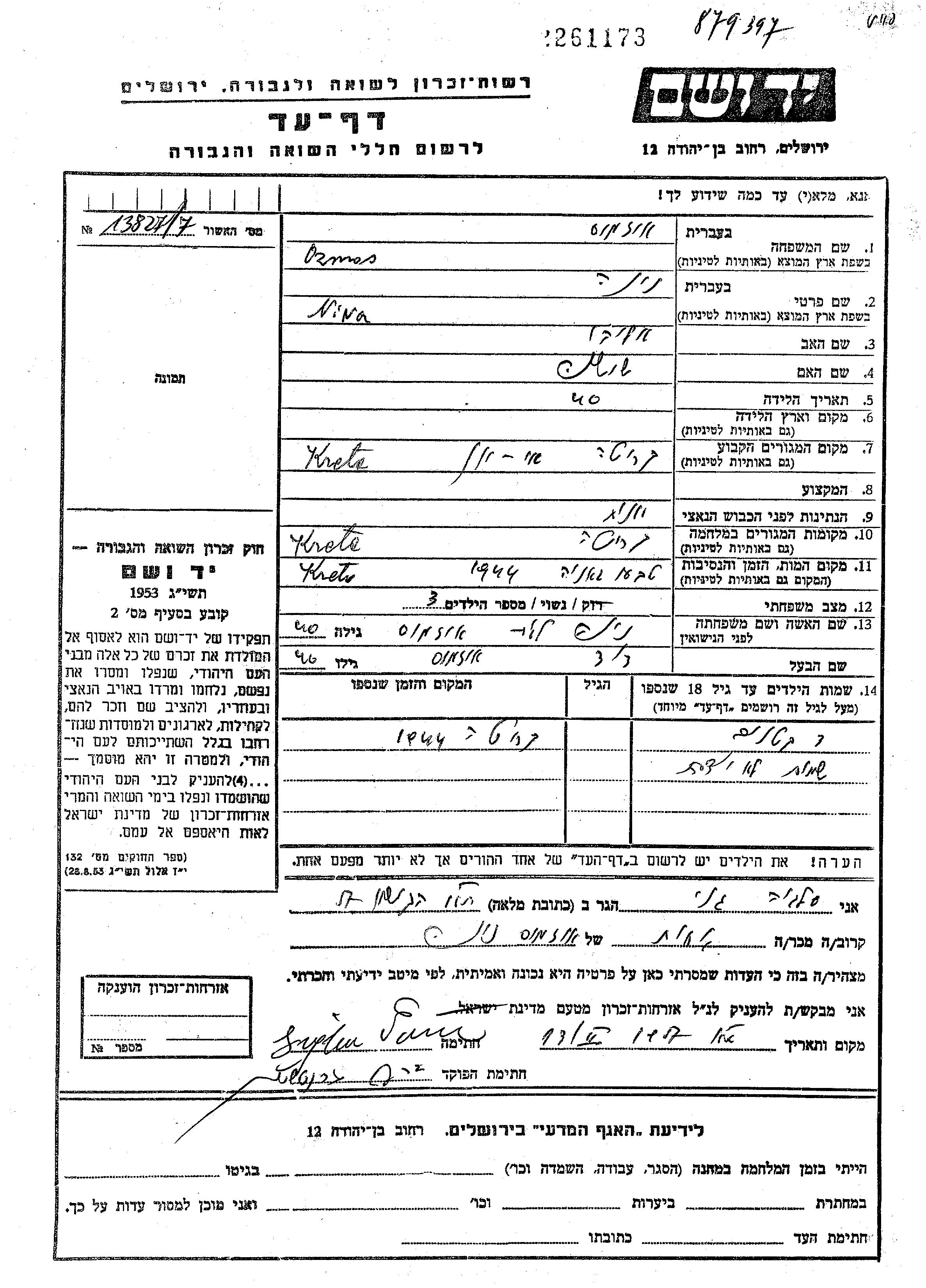 Nina Ozmos, geb. Ozmos wurde im Jahr 1904 in Crete, Griechenland geboren. Sie war die Tochter von Eliahu und Schosana Rosa, geb. Moli. Sie war mit Dawid Verheiratet. Vor dem Zweiten Weltkrieg lebte sie in Crete, Griechenland. Während des Krieges war sie in Crete, Griechenland.