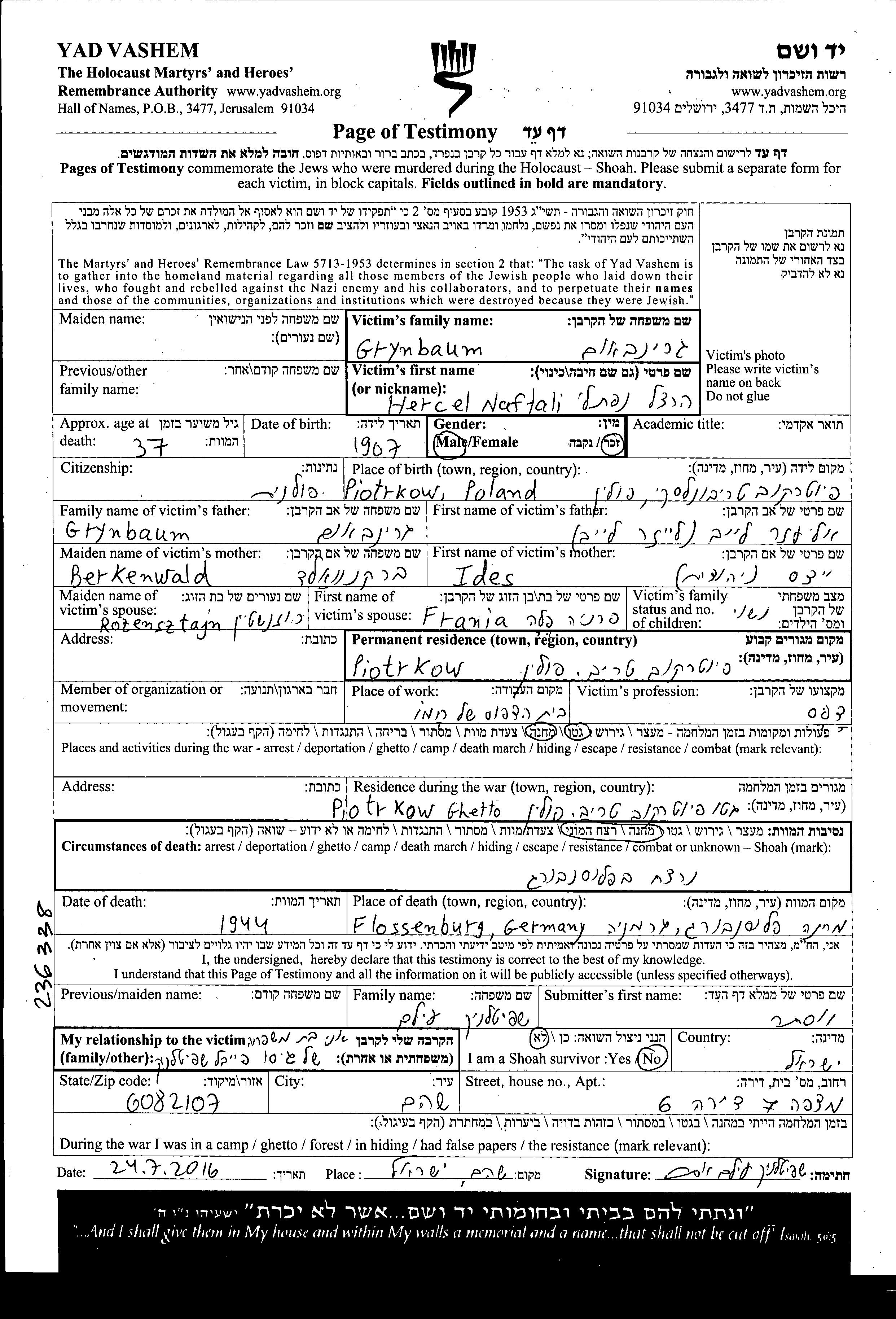 Grynbaum Hercel Naftali 1907 Piotrkow Trybunalski, Polen Gedenkblatt