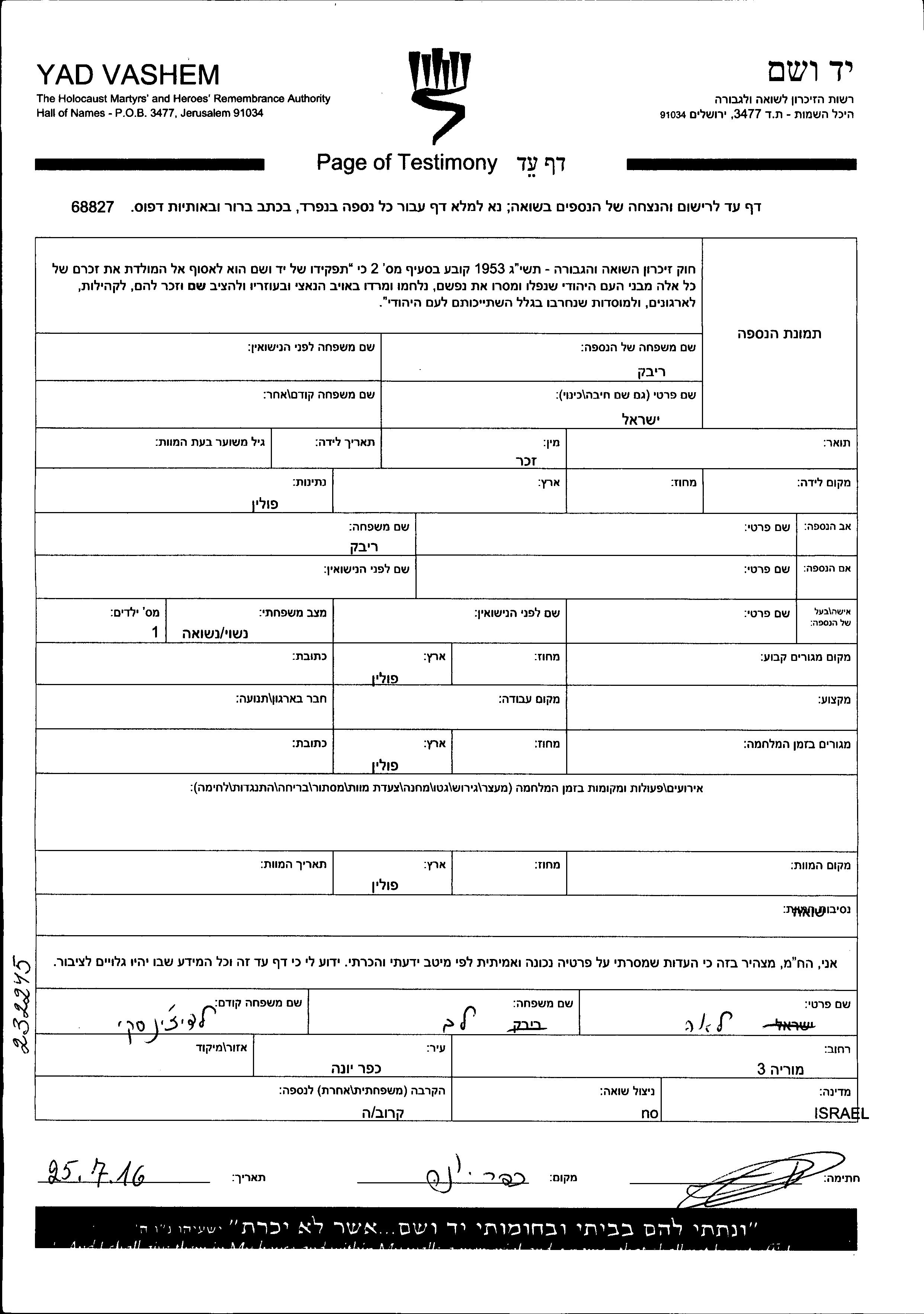 Yisrael Ribak. Er war Verheiratet. Vor dem Zweiten Weltkrieg lebte er in Polen. Während des Krieges war er in Polen.