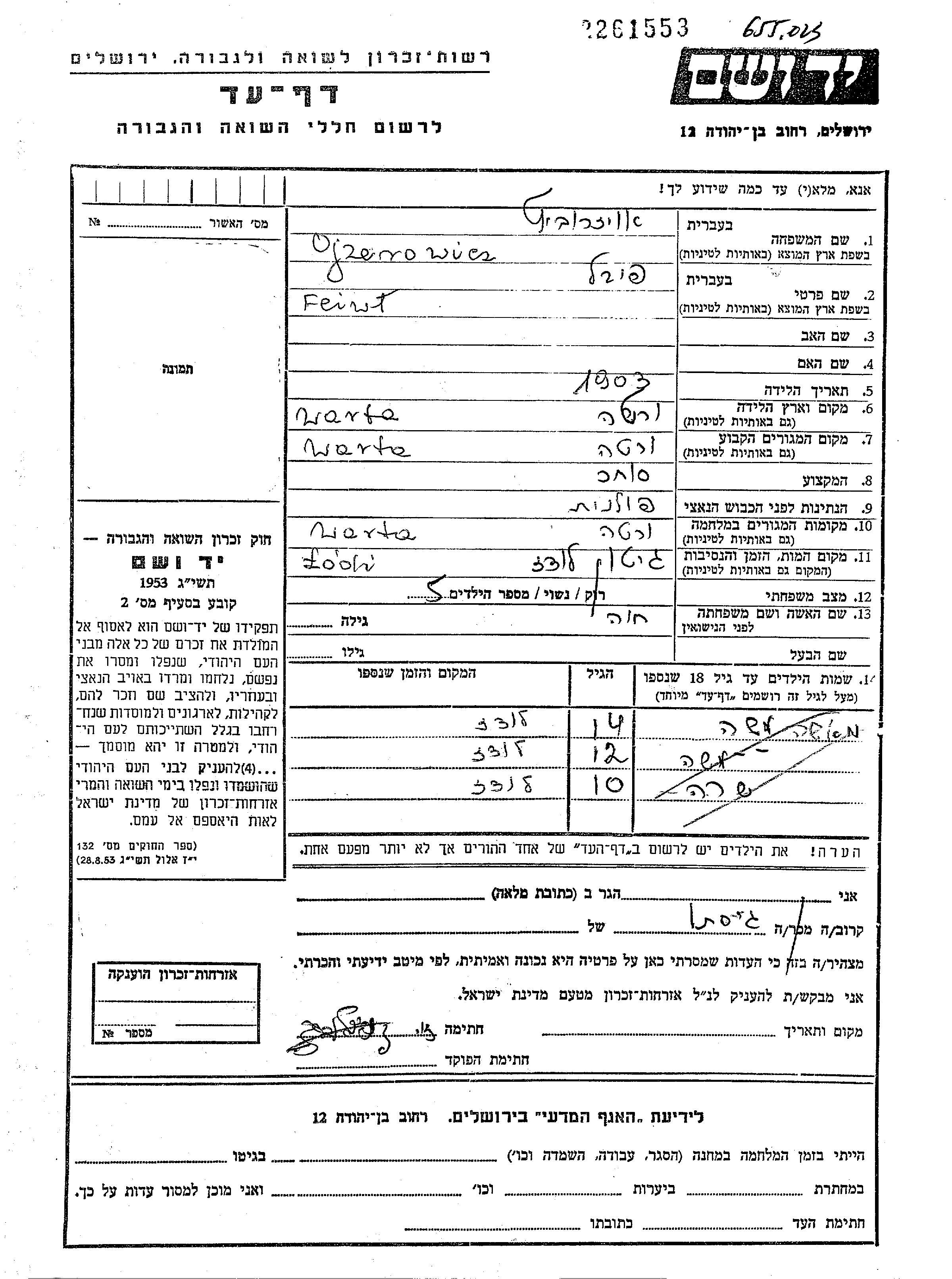 Feiwl Ojzerowicz wurde im Jahr 1903 in Warta, Polen geboren. Er war Kaufmann/-frau und mit Chaja Verheiratet. Vor dem Zweiten Weltkrieg lebte er in Warta, Polen. Während des Krieges war er in Warta, Polen.