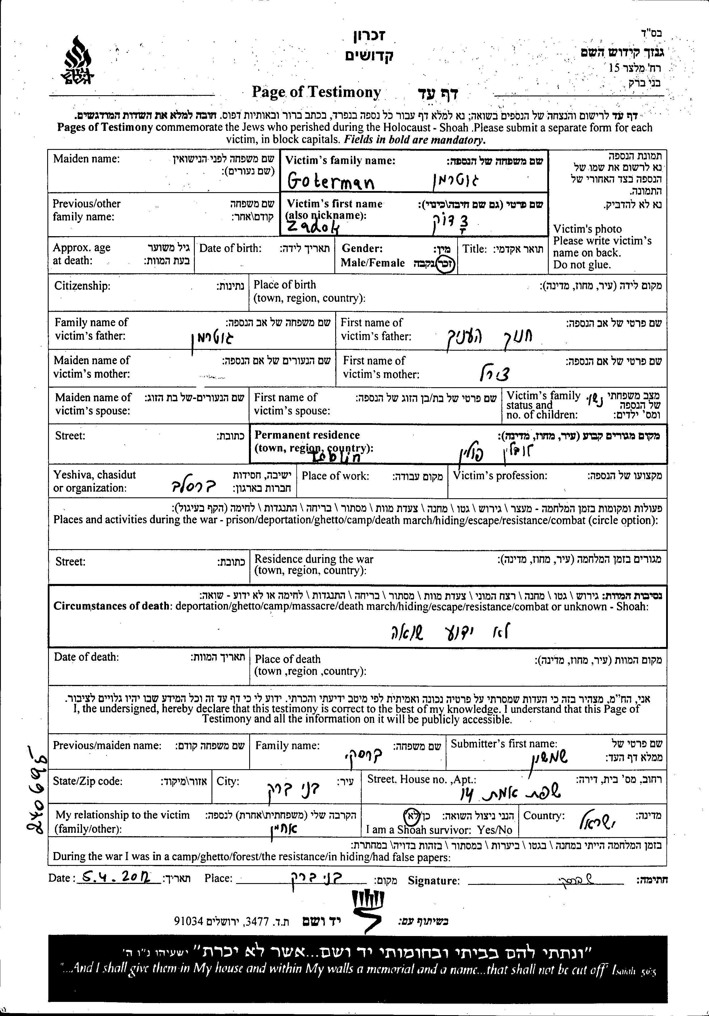Suche nach einem Todesjahr im Zeitraum der Holocaust: 1933 bis 1945. Bitte wählen Sie 'Exakt' im Auswahlmenü, um nur nach einem einzelnen Jahr zu suchen, alternativ können Sie die flexibleren Optionen '+/- 2 Jahre' oder '+/- 5 Jahre' wählen.