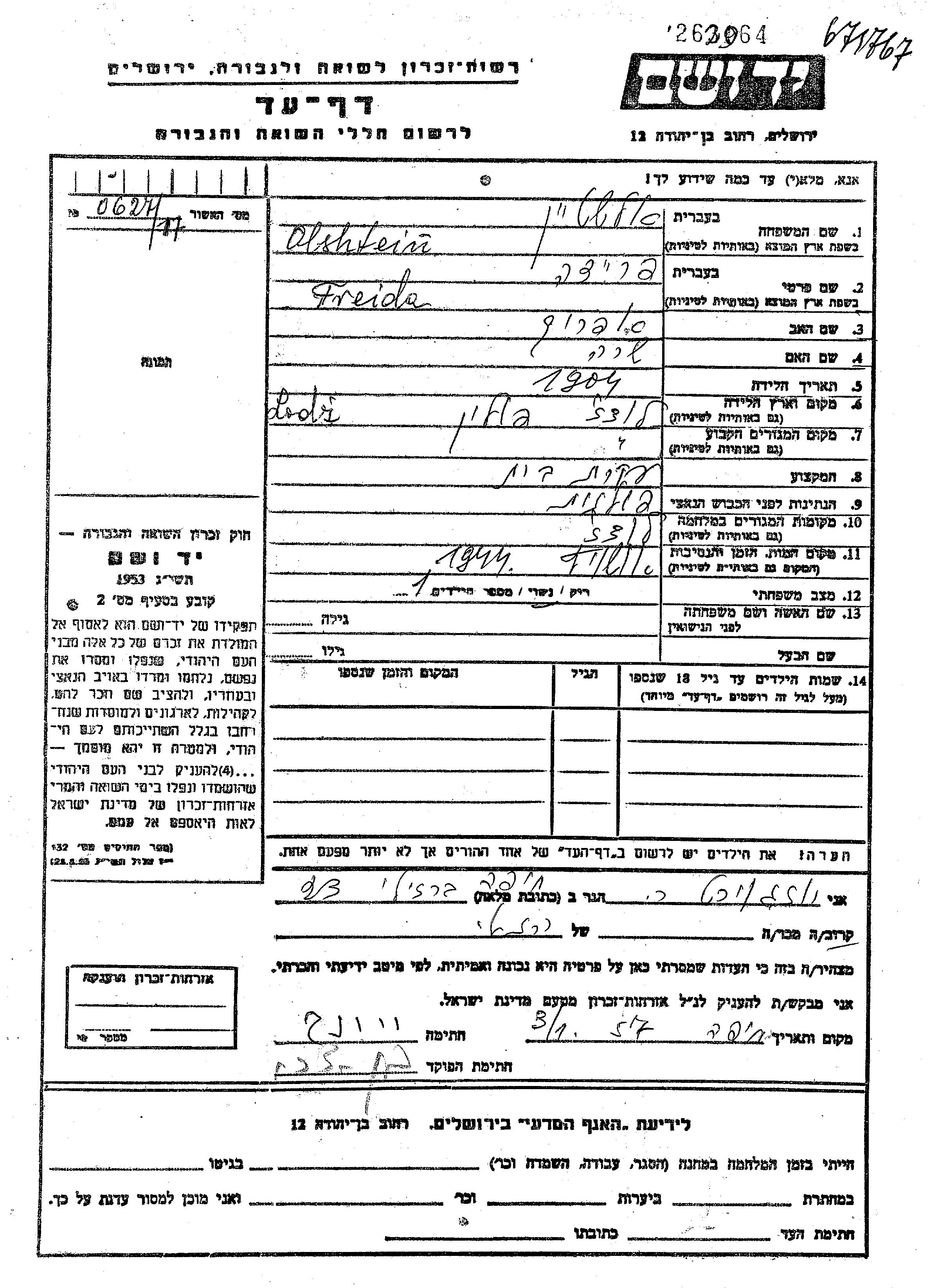 Freida wurde in der Schoah ermordet. Todesort: Auschwitz, Polen im Jahr 1944.