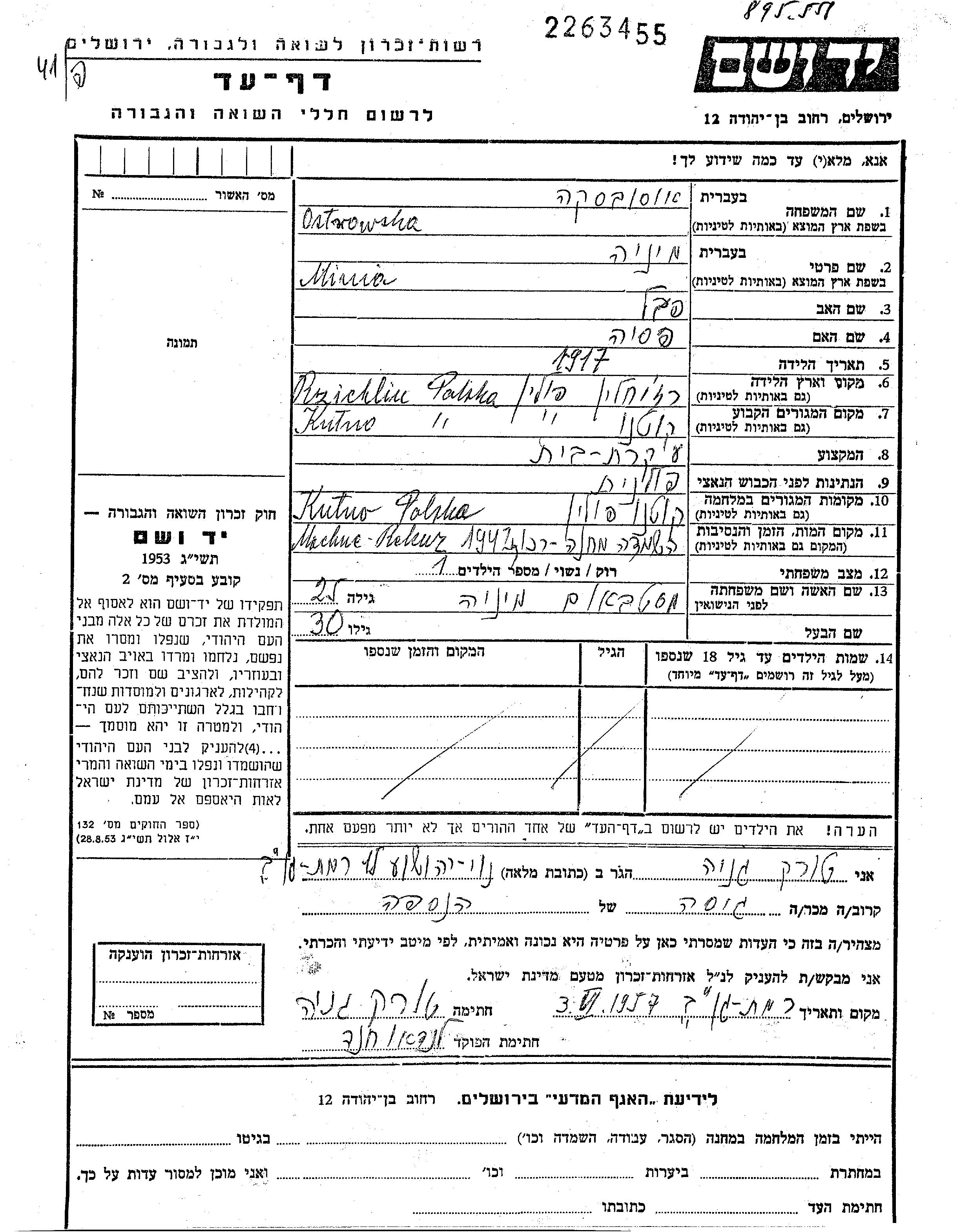 Minia Osowska, geb. Mastbaum wurde im Jahr 1917 in Zychlin, Polen geboren. Sie war die Tochter von Pavel und Pesia. Sie war Hausfrau und mit Zwi Verheiratet. Vor dem Zweiten Weltkrieg lebte sie in Kutno, Polen. Während des Krieges war sie in Kutno, Polen.