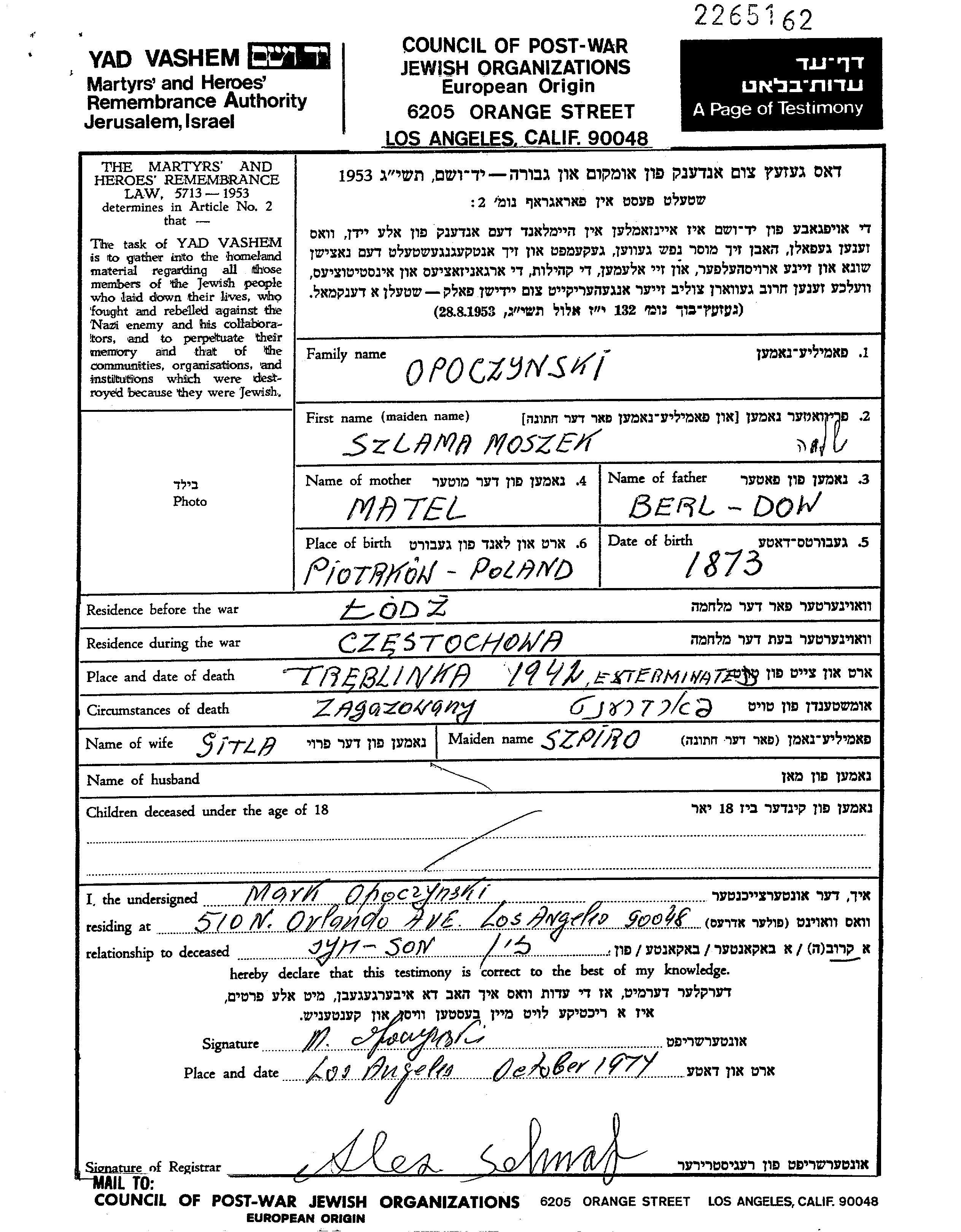 Szlama Mosze Opoczynski wurde im Jahr 1873 in Piotrkow Trybunalski, Polen geboren. Er war der Sohn von Berl Dov und Matel Mate. Er war mit Gitla Verheiratet. Vor dem Zweiten Weltkrieg lebte er in Lodz, Polen. Während des Krieges war er in Czestochowa, Polen.