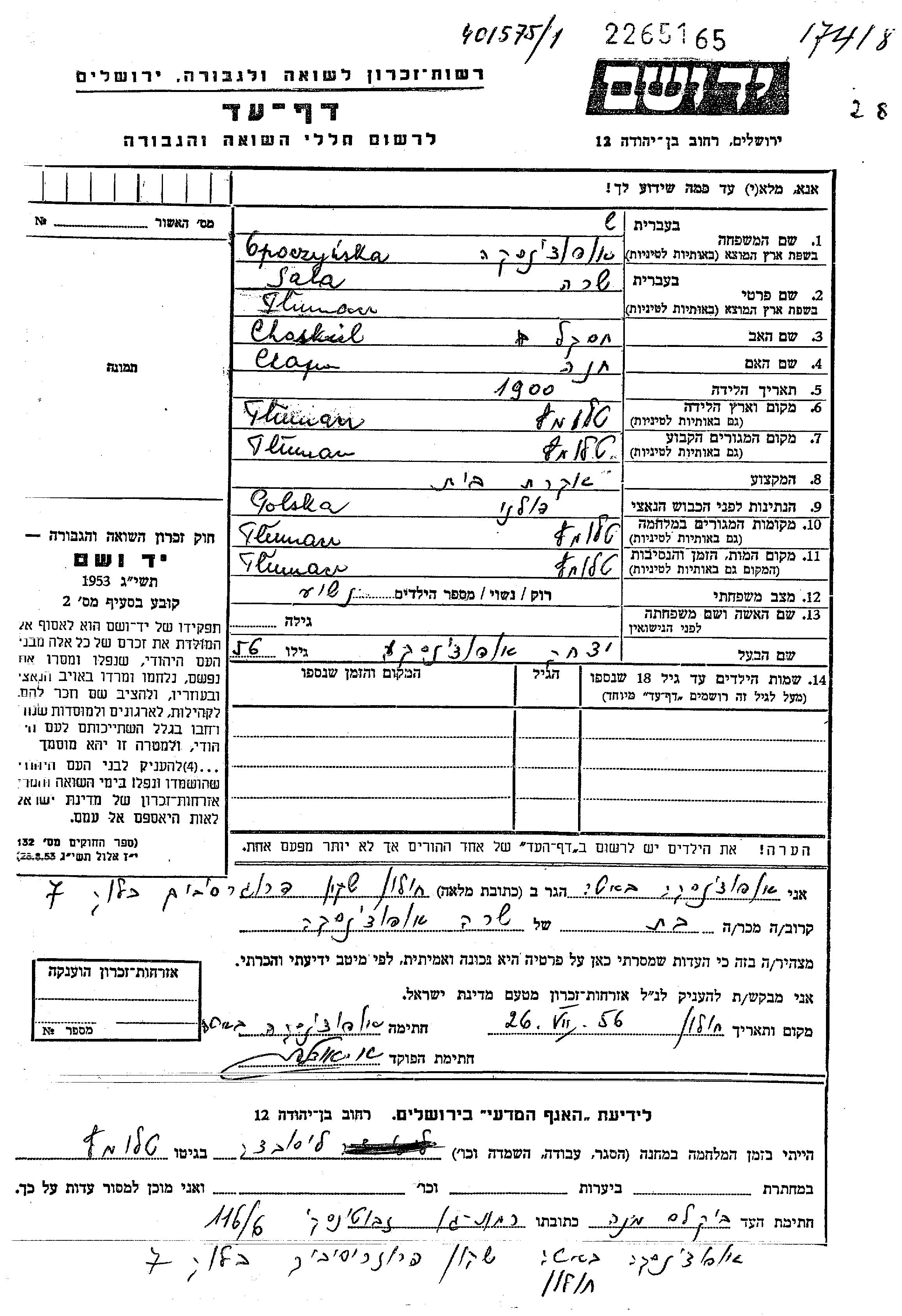 Sala Sara Opoczynski wurde im Jahr 1900 in Tlumacz, Polen geboren. Sie war die Tochter von Chaskiel und Khana. Sie war Hausfrau und mit Ytzkhak Verheiratet. Vor dem Zweiten Weltkrieg lebte sie in Tlumacz, Polen. Während des Krieges war sie in Tlumacz, Polen.