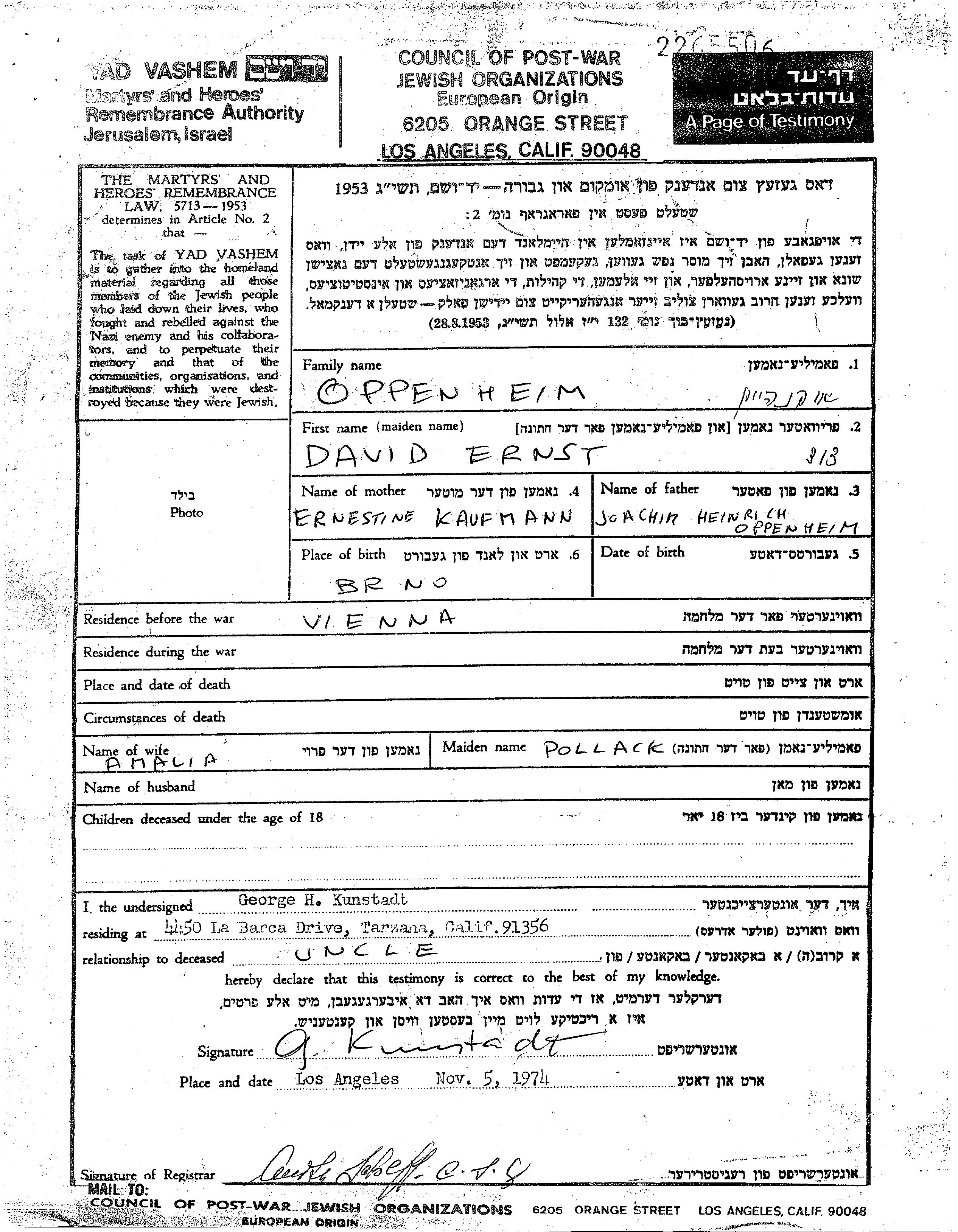 Ernst David Oppenheim wurde in Brno, Tschechoslowakei geboren. Er war der Sohn von Joachim Heinrich und Ernestine, geb. Kaufmann. Er war mit Amalia Verheiratet. Vor dem Zweiten Weltkrieg lebte er in Wien, Österreich.