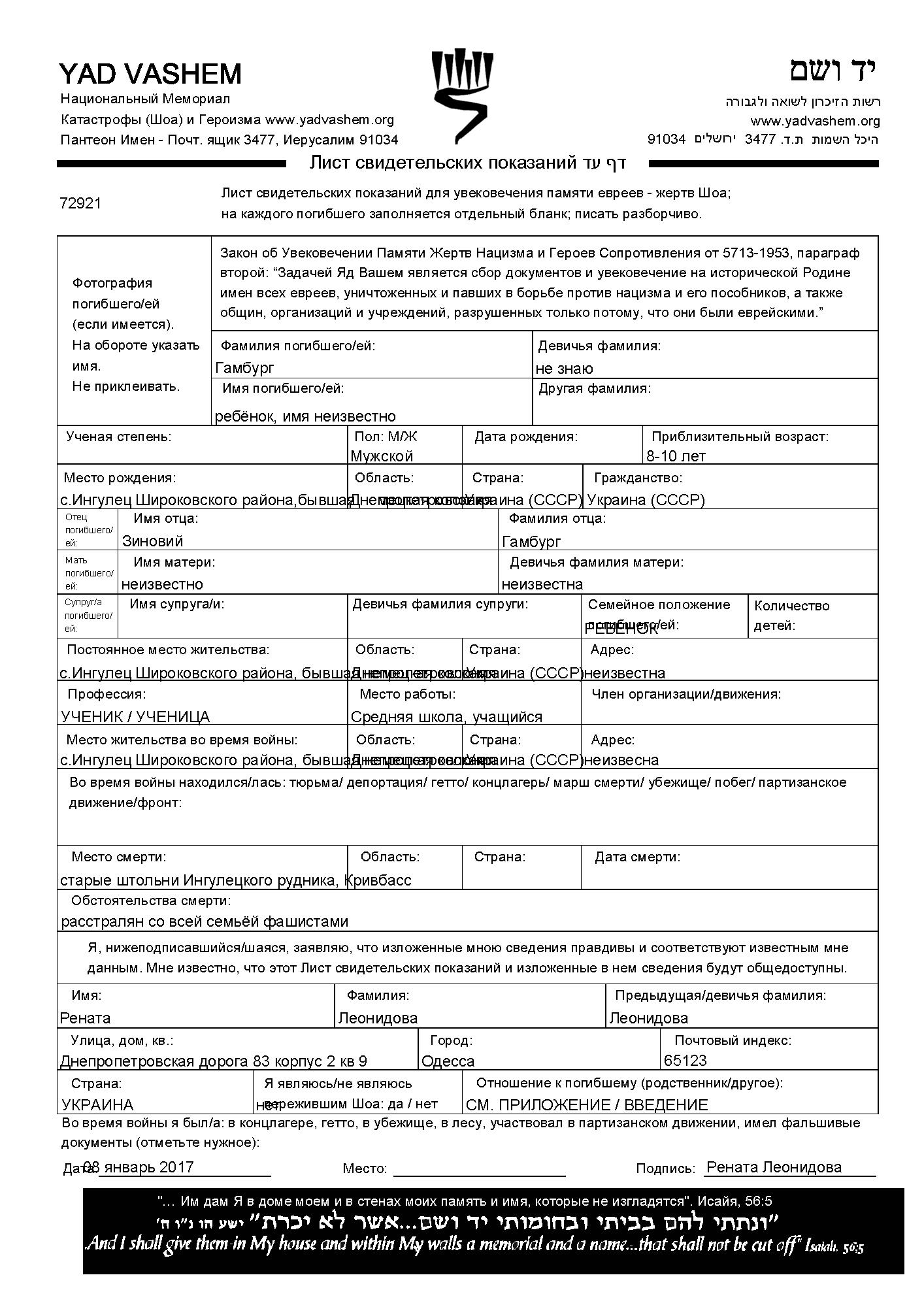 Gamburg Vorname unbekannt Ingulets, Ukraine (UdSSR) Gedenkblatt (digital)