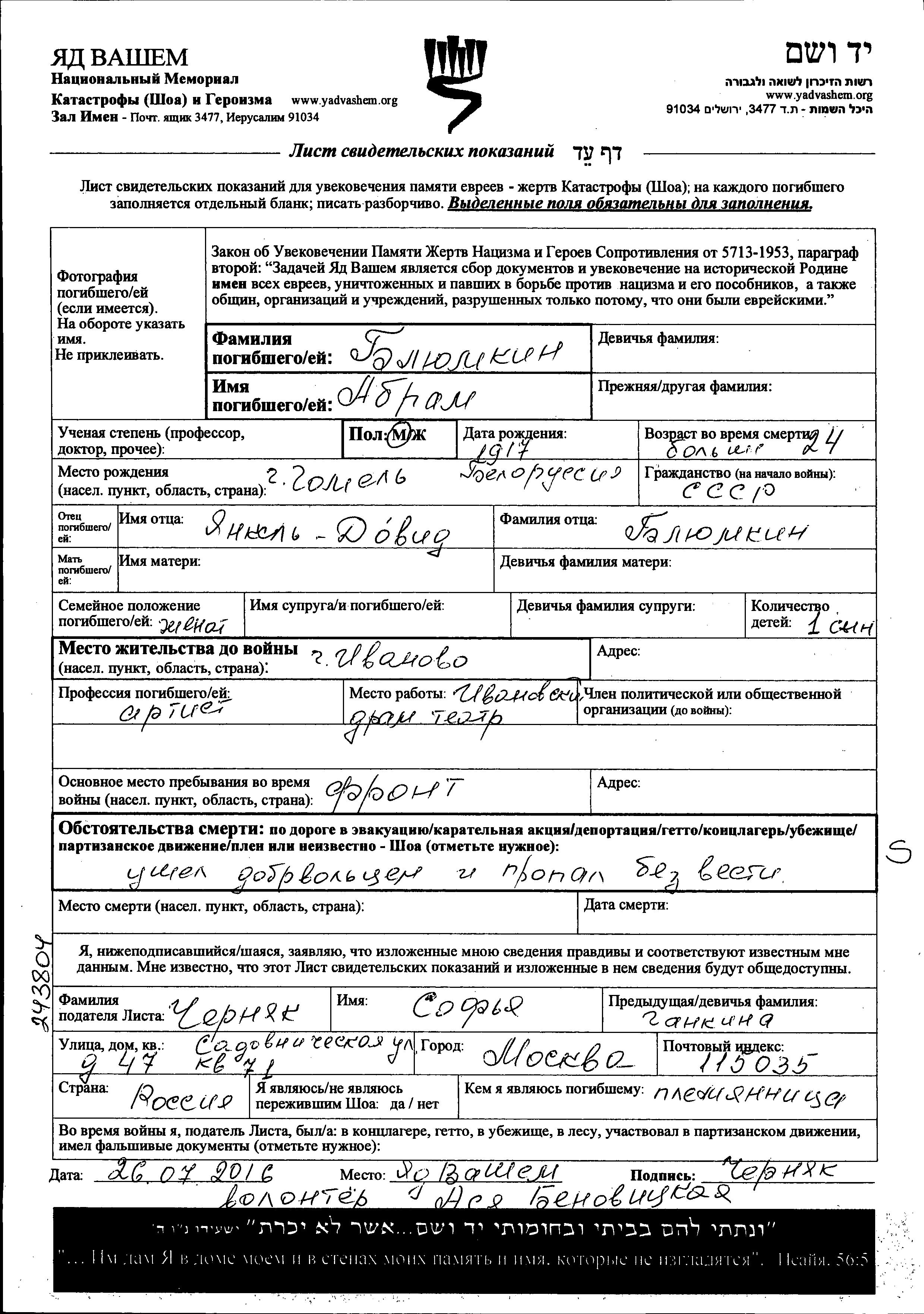 Abram Blyumkin wurde im Jahr 1917 in Gomel, Weißrussland (UdSSR) geboren. Er war der Sohn von Yankel Dovid. Er war Artist teatra und Verheiratet. Vor dem Zweiten Weltkrieg lebte er in Ivanovo, Russland (UdSSR). Während des Krieges war er in die Sowjetischen Streitkräfte.