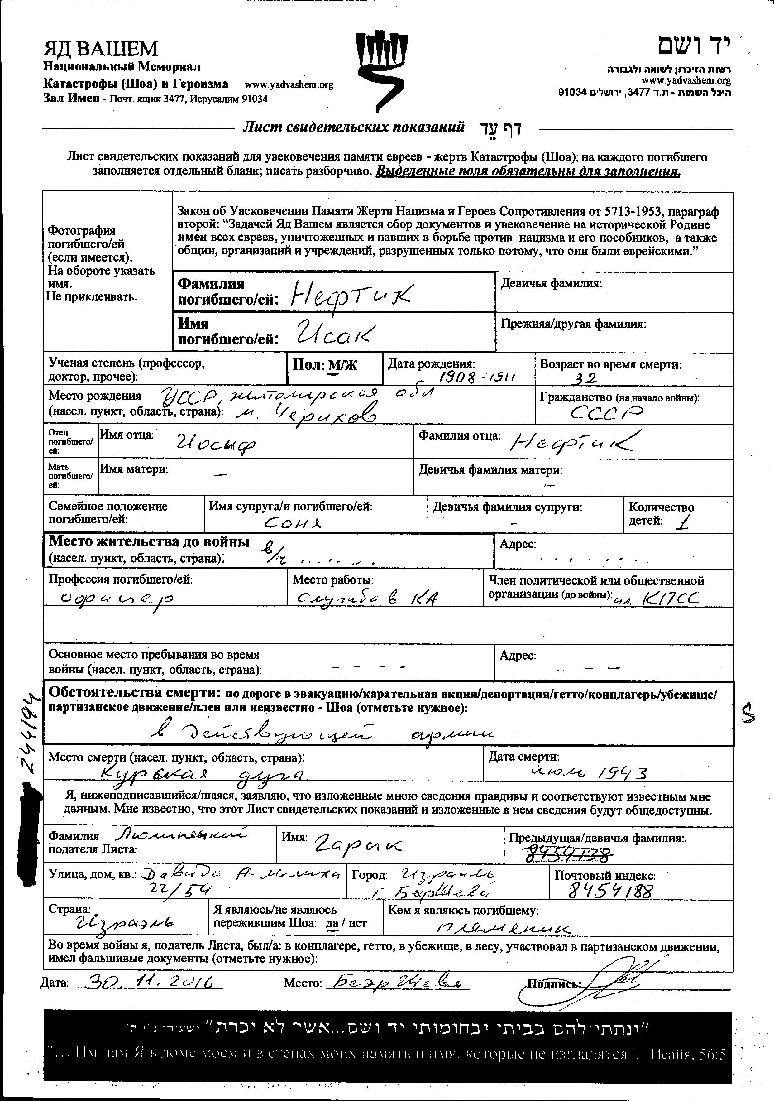 Isak im Militärdienst umgekommen. Todesort: Kurskaya Duga, Russland (UdSSR) im Jahr 07/1943.