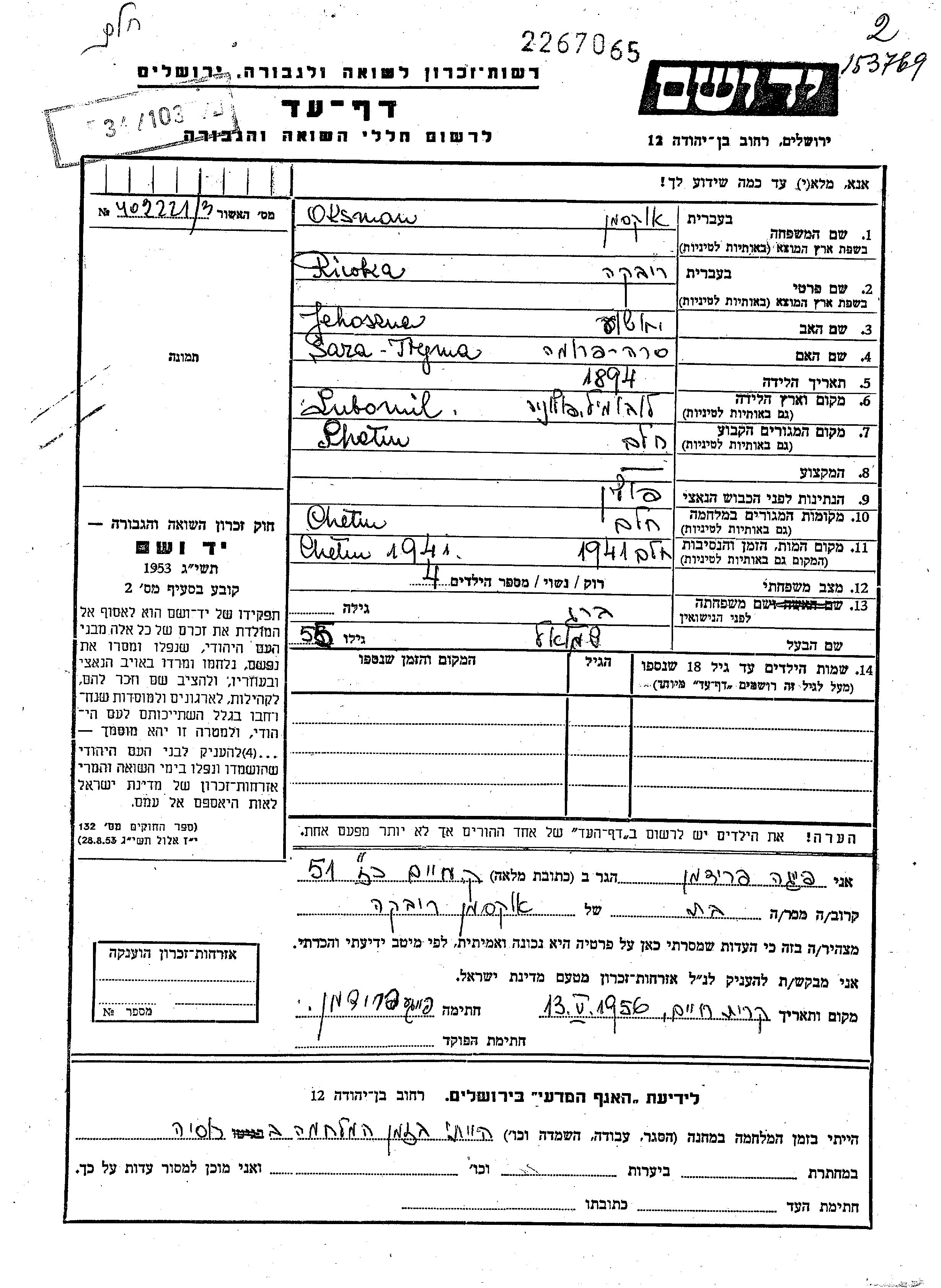 Oksman Riwka 1894 Chelm, Polen Gedenkblatt