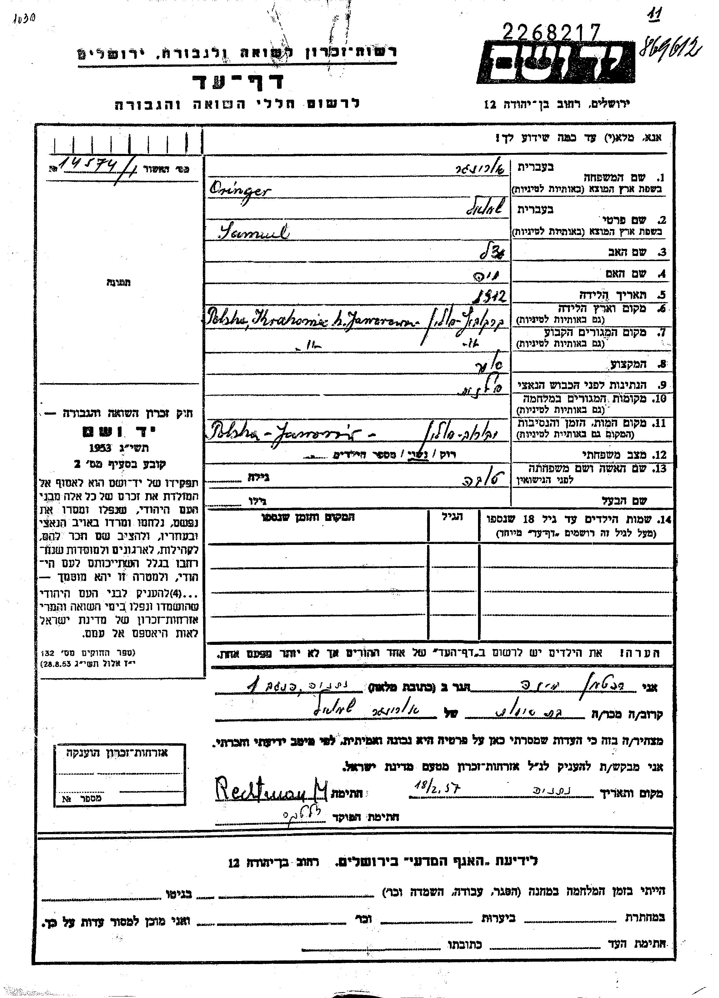 Shmuel Oringer wurde im Jahr 1912 in Jaworow, Polen geboren. Er war der Sohn von Dov und Mia. Er war Kaufmann/-frau und mit Tova Verheiratet. Vor dem Zweiten Weltkrieg lebte er in Jaworow, Polen. Während des Krieges war er in Jaworow, Polen.