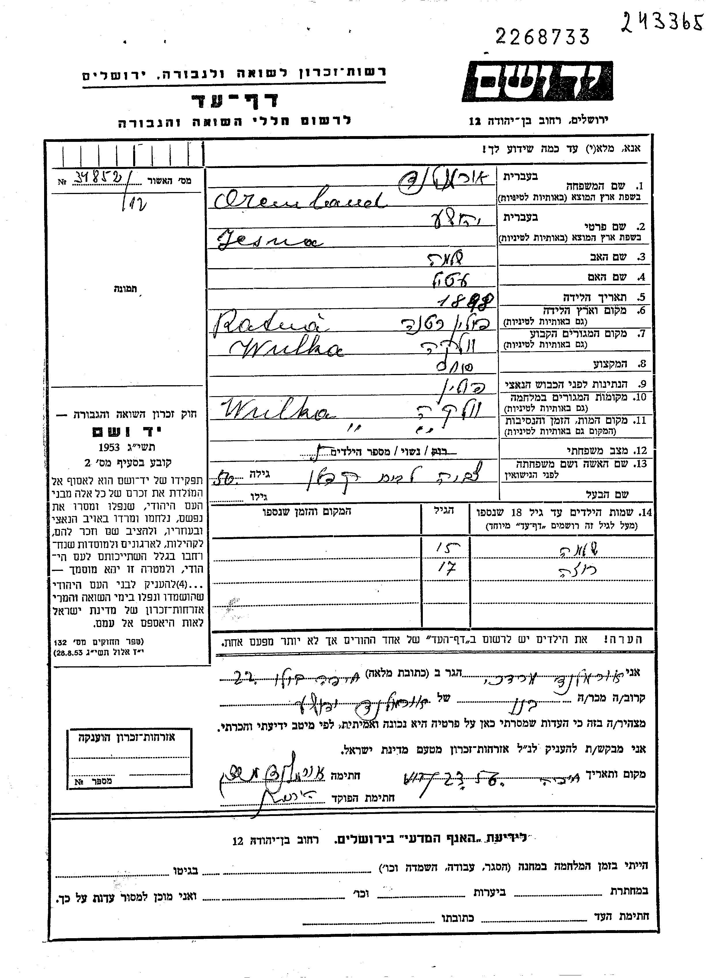 Jesua Oremland wurde im Jahr 1898 in Ratne, Polen geboren. Er war der Sohn von Shlomo und Etel. Er war Kaufmann/-frau und mit Zivja Verheiratet. Vor dem Zweiten Weltkrieg lebte er in Wolka Szczytynska, Polen. Während des Krieges war er in Wolka Szczytynska, Polen.