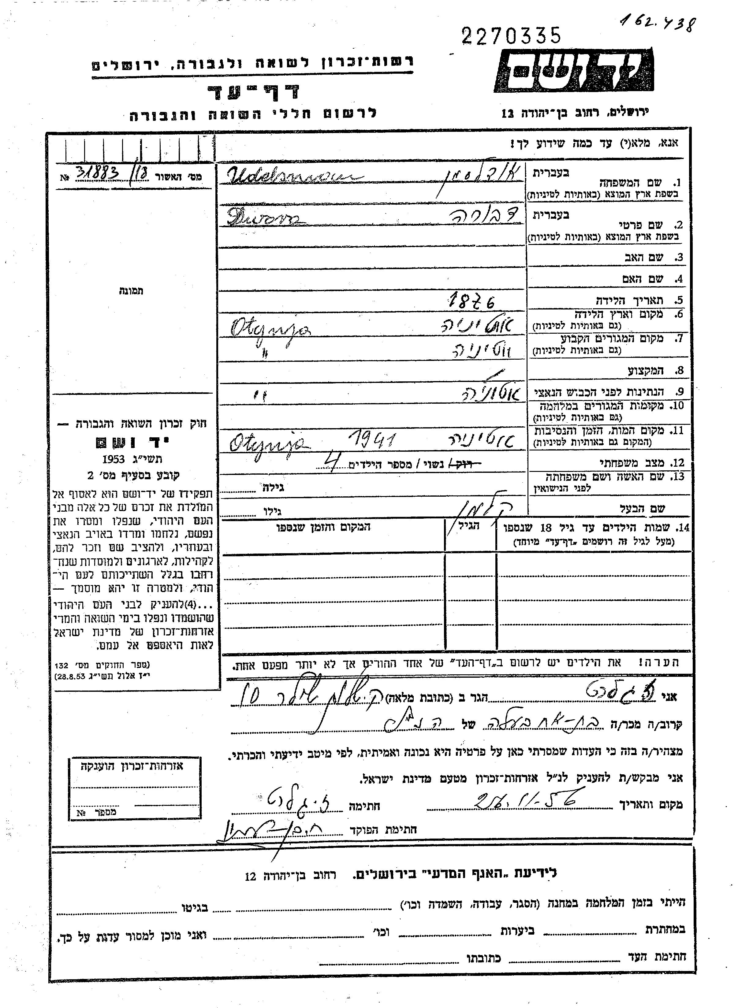 Dwora Udelsman, geb. Shtoper wurde im Jahr 1876 in Ottynia, Polen geboren. Sie war mit Kalman Verheiratet. Vor dem Zweiten Weltkrieg lebte sie in Ottynia, Polen.