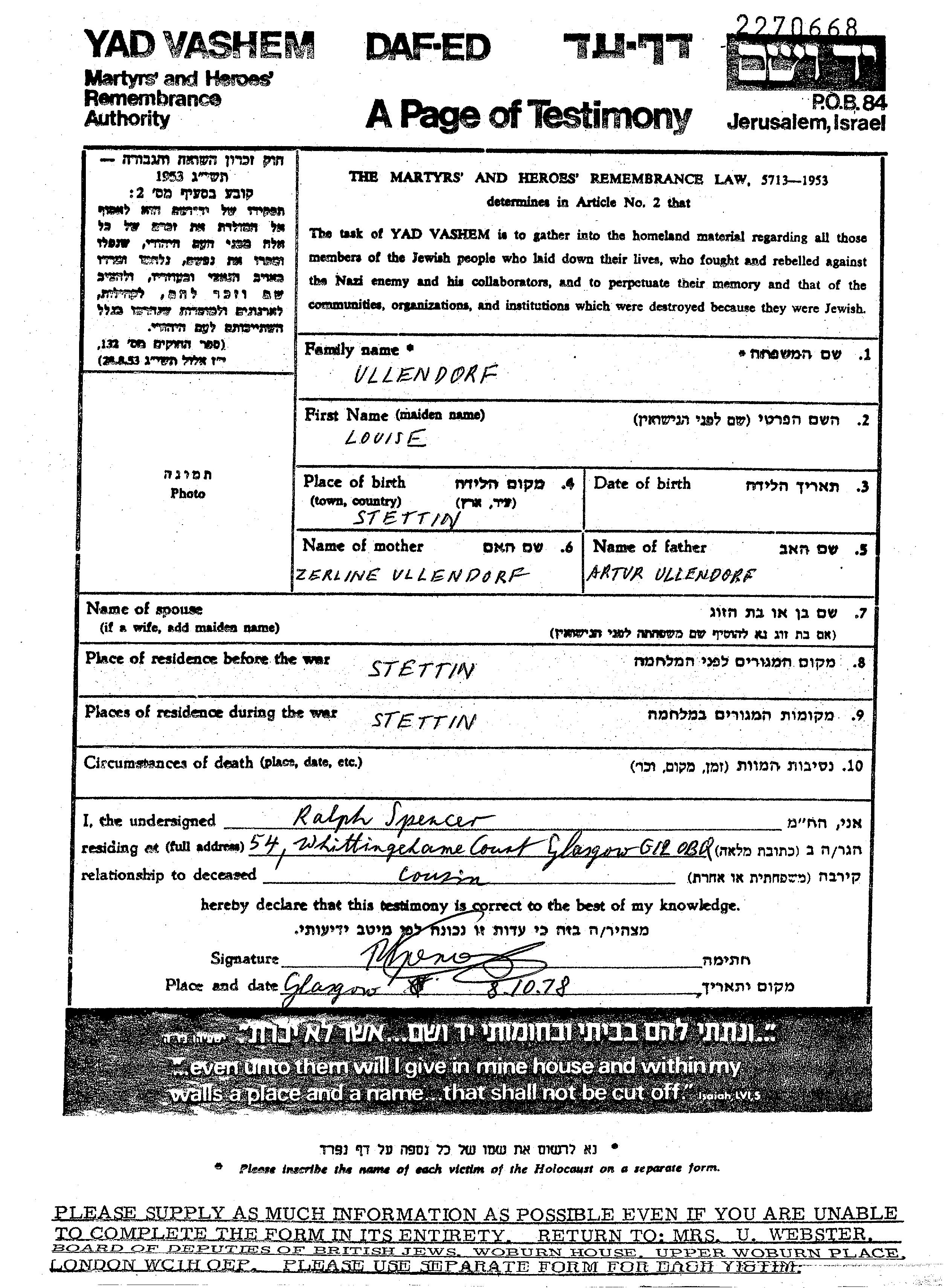 Louise Ullendorf wurde in Stettin, Deutsches Reich geboren. Sie war die Tochter von Artur und Zerline, geb. Noack. Vor dem Zweiten Weltkrieg lebte sie in Stettin, Deutsches Reich. Während des Krieges war sie in Stettin, Deutsches Reich.